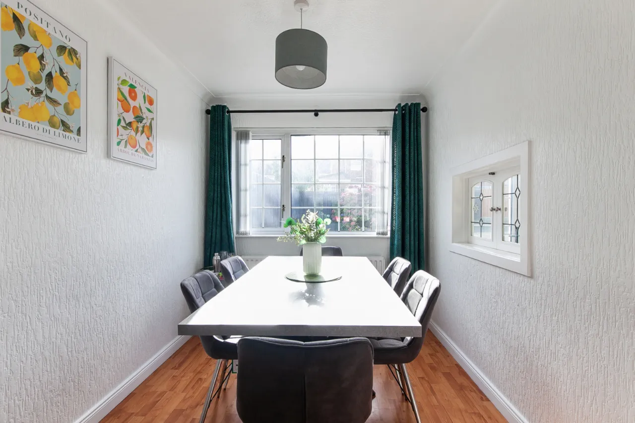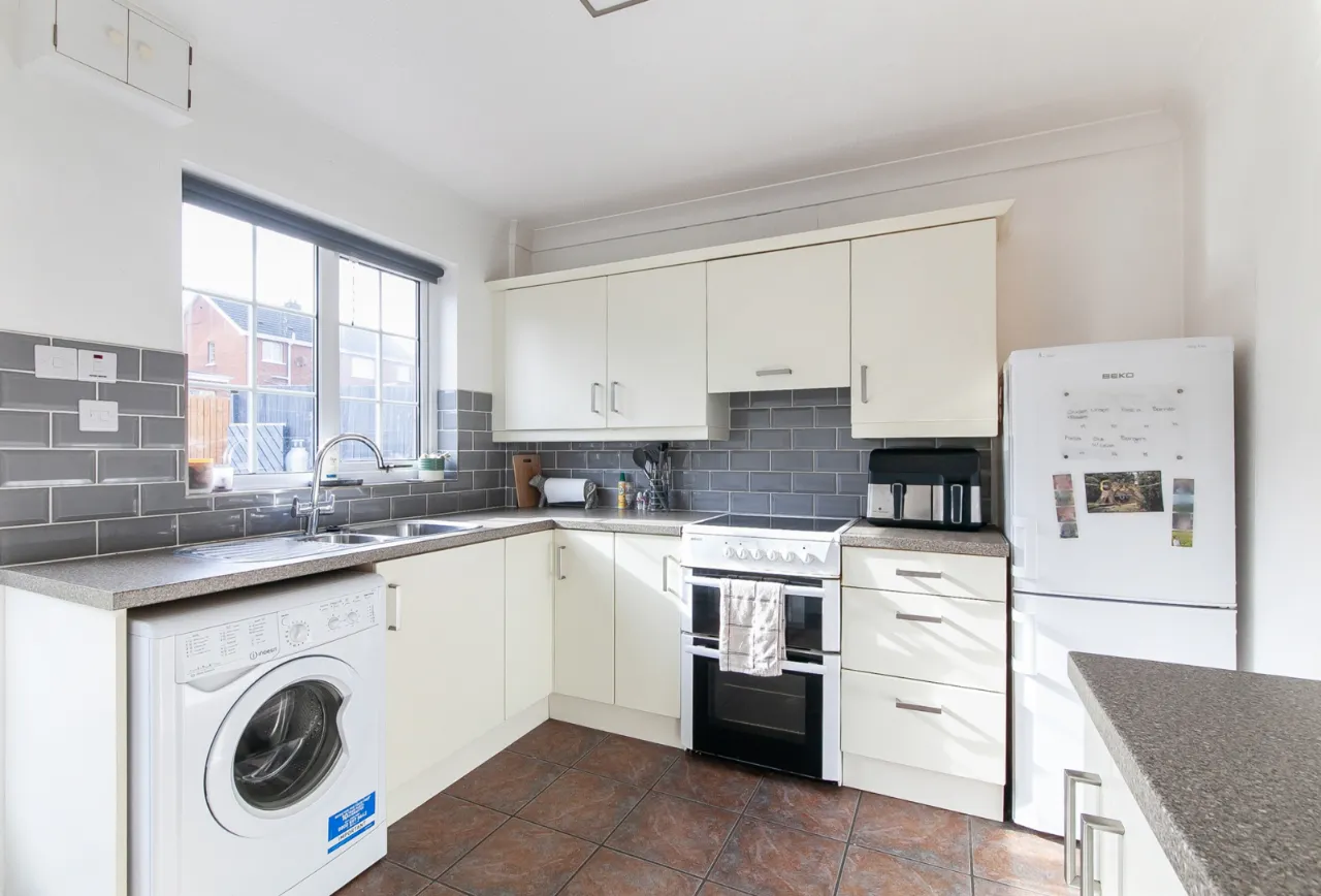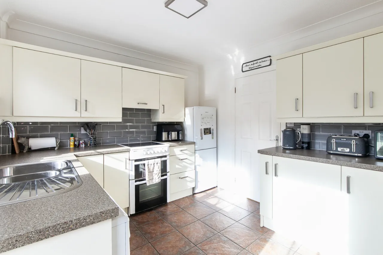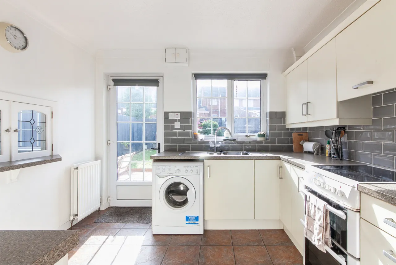 The ground floor features a welcoming entrance hall with cloak storage neatly tucked under the stairs. A spacious open-plan living and dining room provides an ideal space for both relaxing and entertaining. To the rear, a fitted kitchen offers good worktop space and direct access to the private rear garden, making it perfect for family life or hosting guests.