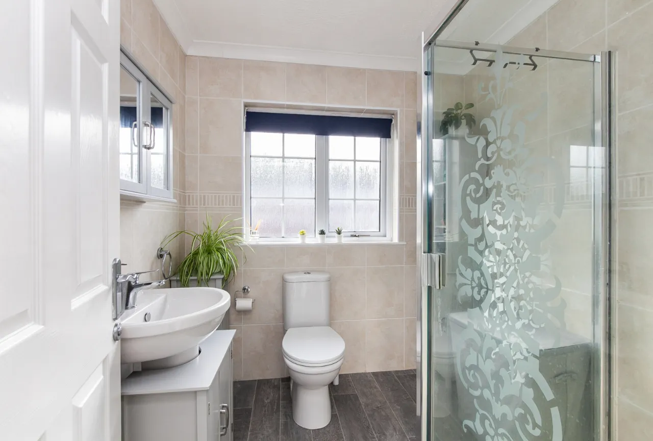 Comprises of enclosed corner shower unit with shower screen, low flush WC, pedestal wash hand basin with mixer tap, tiled walls and corniced ceiling.