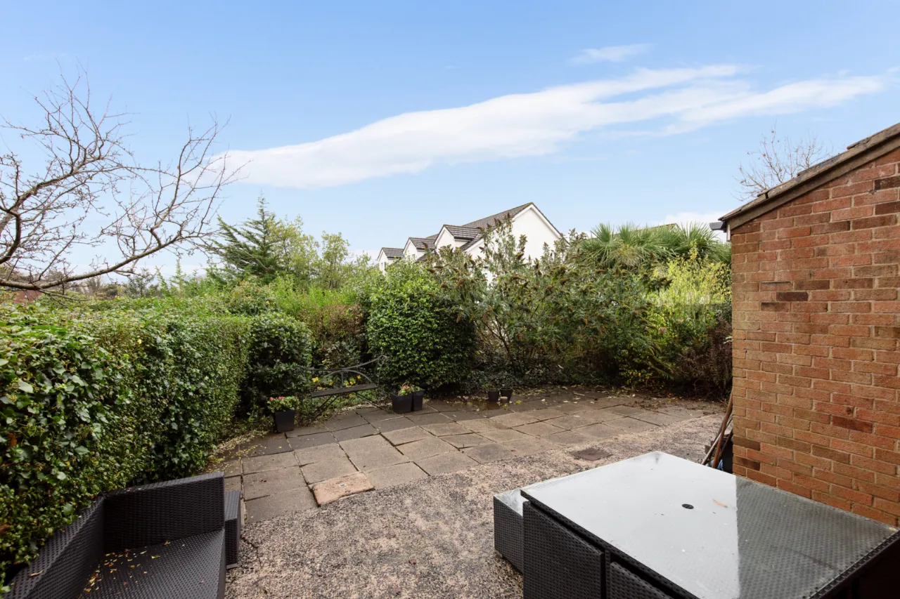 South East facing enclosed garden with paved patio area. Shrubbery, mature hedging, outside tap and light.