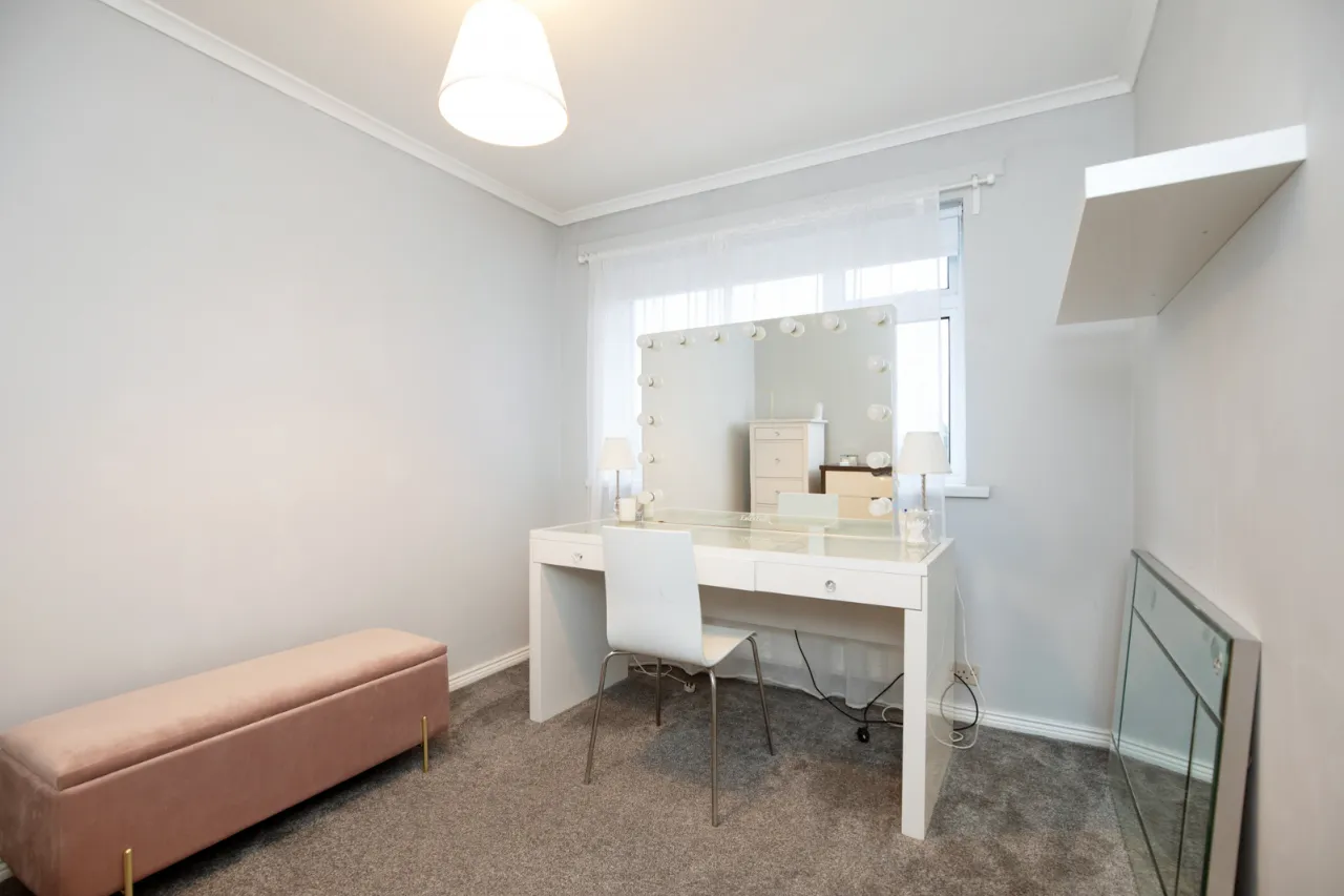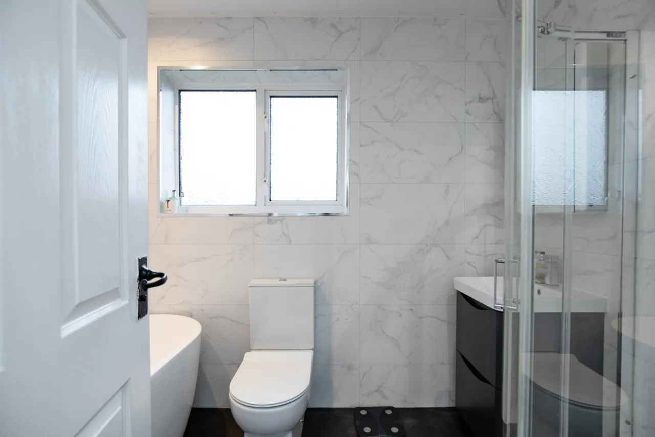Contemporary bathroom suite comprising of free standing bath with mixer tap, enclosed corner shower unit with shower screen, ceramic bowl sink unit with mixer tap and vanity storage underneath. Low flush WC, recessed lighting, extractor fan and Bluetooth connection for speakers.