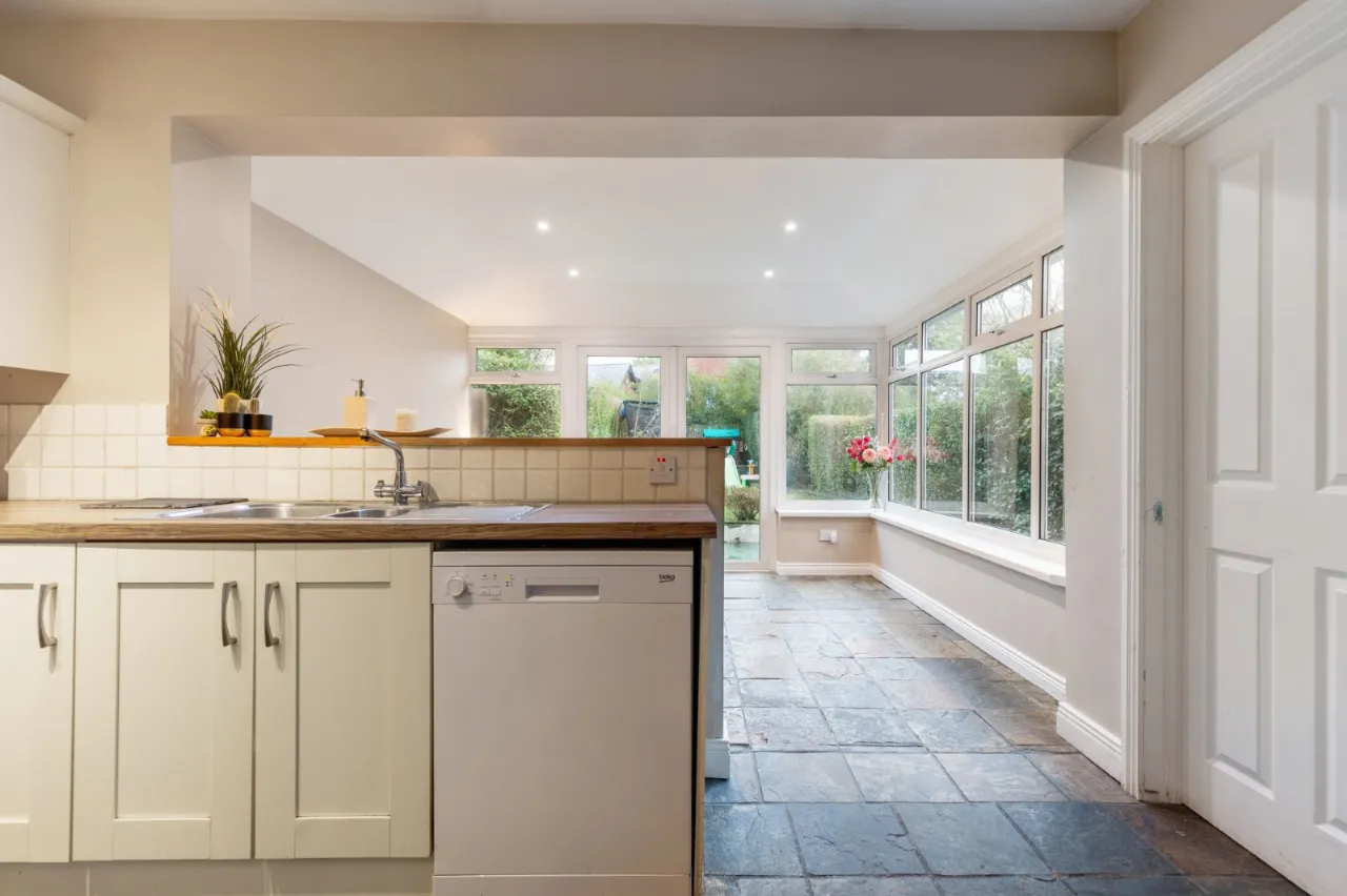 The spacious open-plan kitchen to sun room, comfortably accommodates both dining and sitting areas, making it a superb hub for modern family living and entertaining.