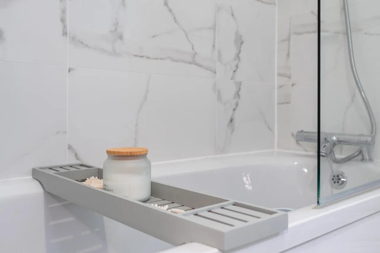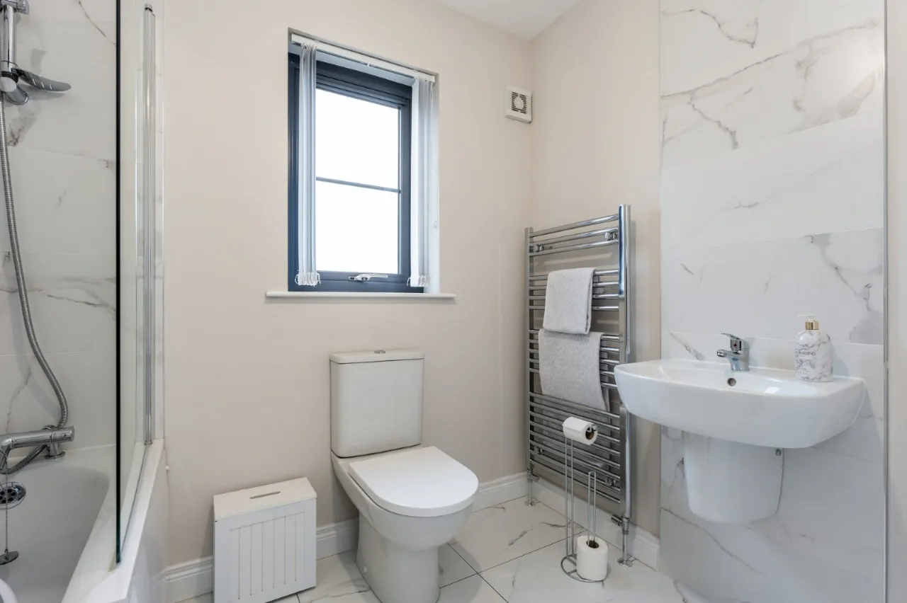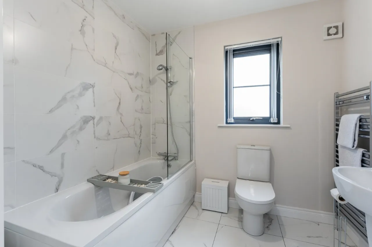 Modern white suite comprising: Panelled bath with ixer taps and telephone hand shower over bath, glass screen, wall mounted wash hand basin with mixer taps, push button WC, chrome towel radiator, feature marble effect wall and floor tiling, extractor fan.