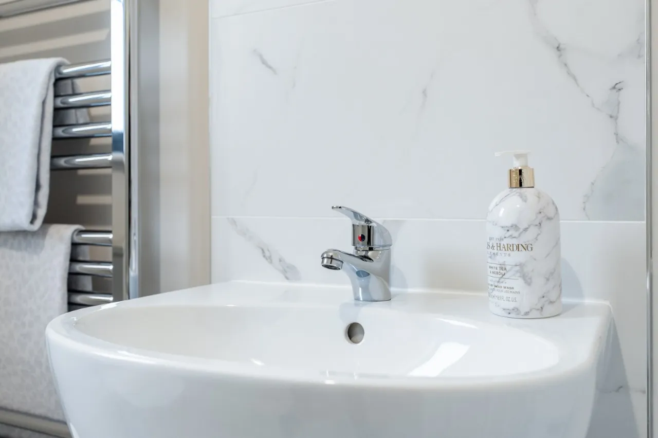 Modern white suite comprising: wall mounted wash hand basin with mixer taps, push button WC, feature tiled floor, extractor fan.
