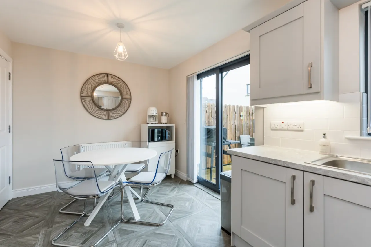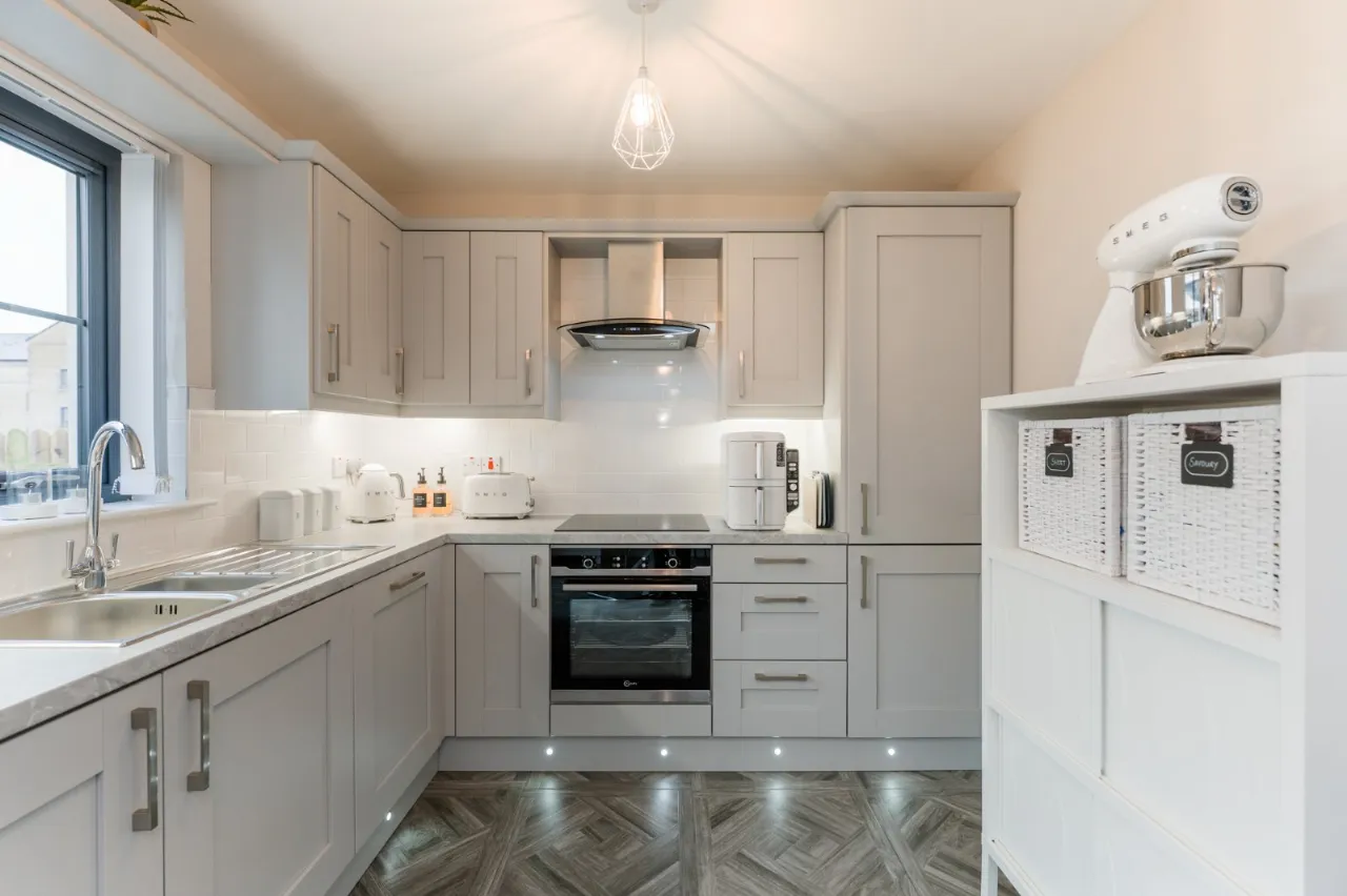 1.5 tub single drainer stainless steel sink unit with mixer taps, range of high and low level light grey shaker style units, marble effect Formica roll edge work surfaces, 4 ring ceramic hob unit, built in oven, stainless steel extractor hood, integrated fridge freezer, dishwasher and washing machine, concealed lighting, feature tiled floor, double glazed sliding patio doors to rear enclosed garden.