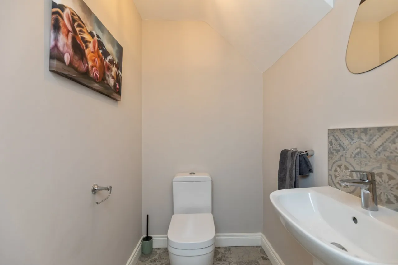 Modern white suite comprising: Large separate fully tiled shower cubicle with thermostatically controlled shower, drench head and telephone hand shower, wall mounted wash hand basin with mixer taps, push button WC, chrome towel radiator, feature ceramic tiled floor, LED recessed spotlighting, extractor fan, wired for wall mounted mirror.