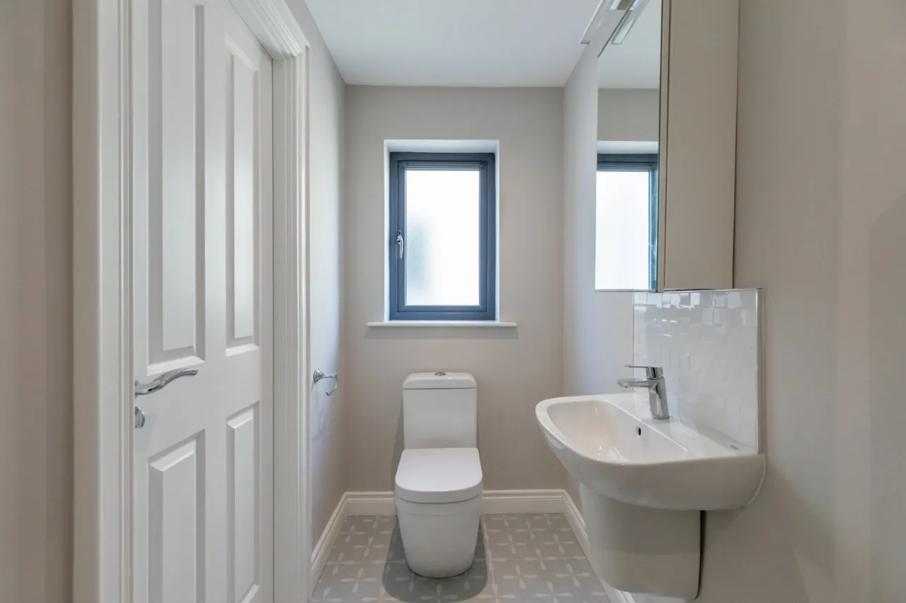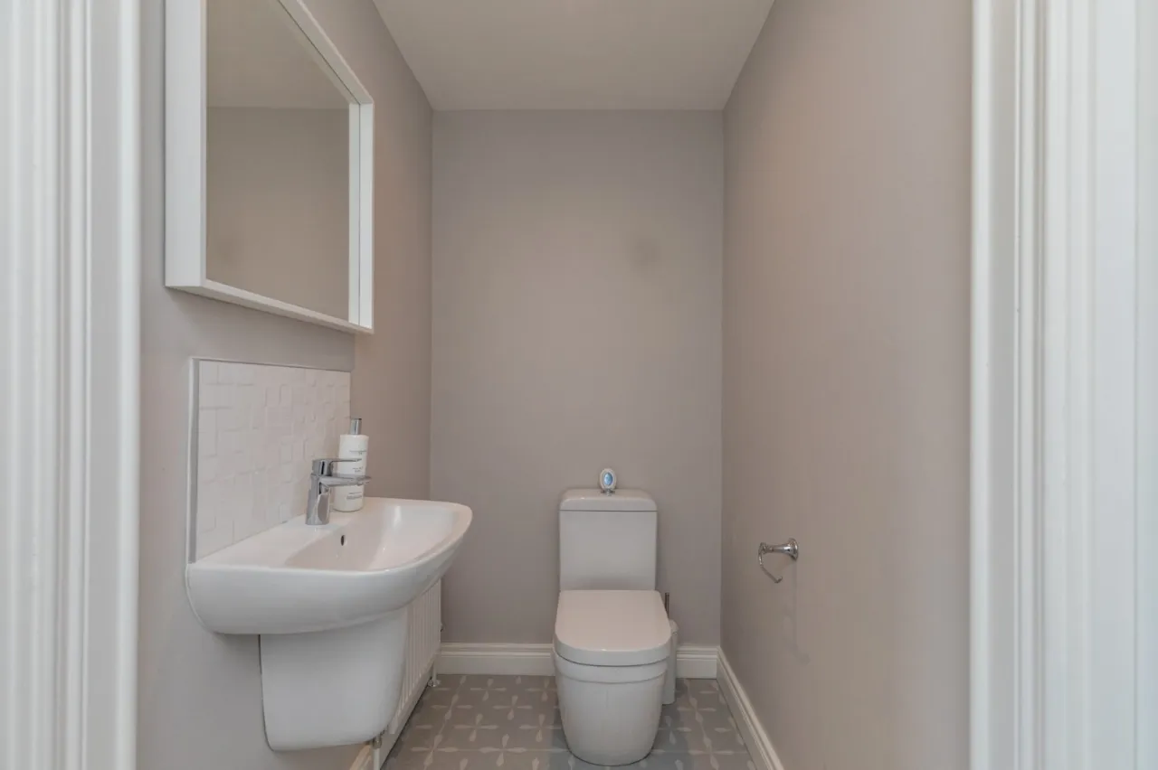 Modern white suite comprising: wall mounted wash hand basin with mixer taps, push button WC, feature ceramic tiled floor, extractor fan.