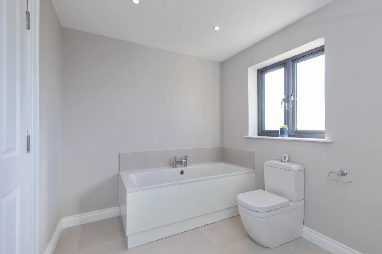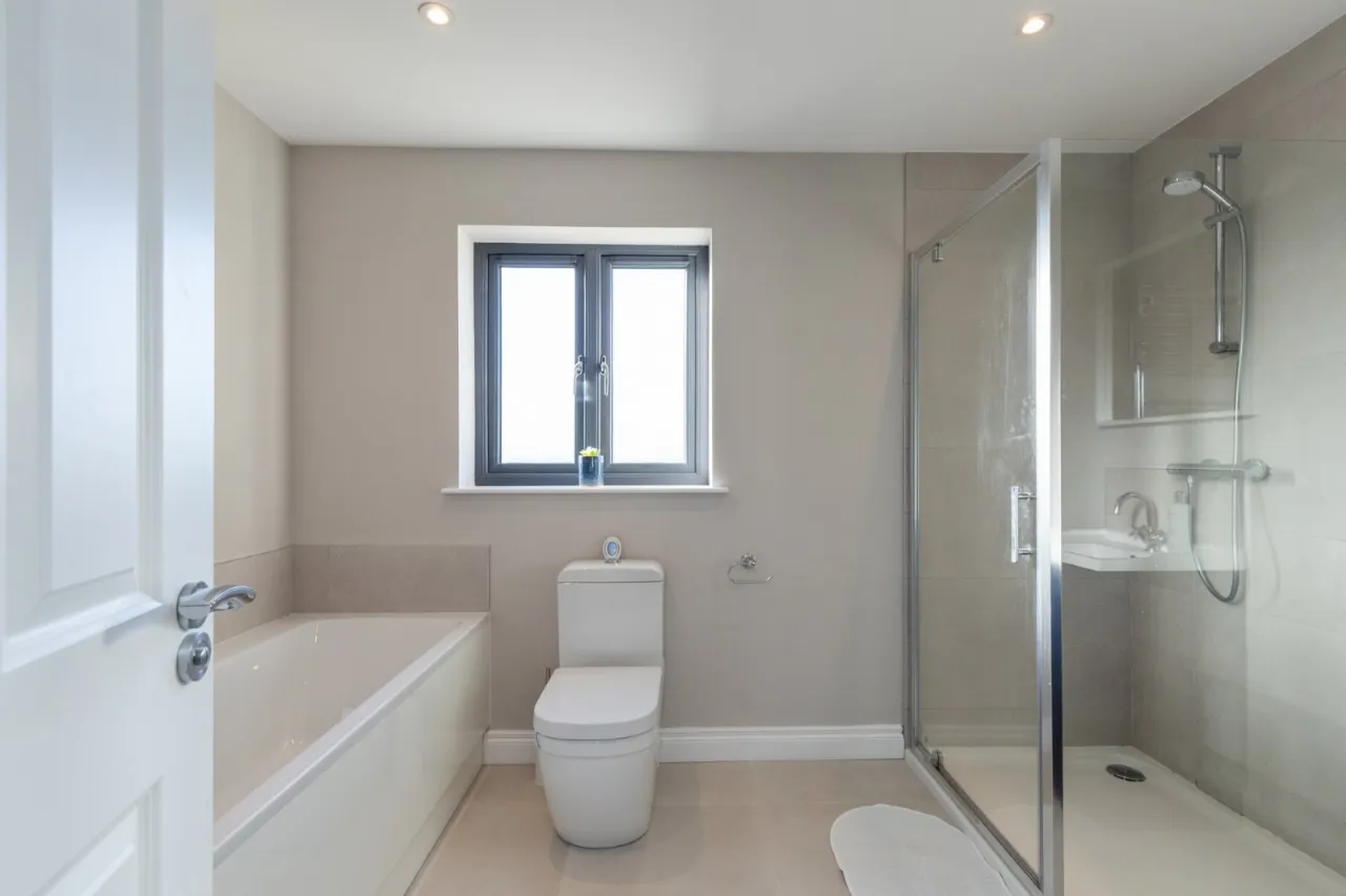 Modern white suite comprising: Panelled bath with chrome mixer taps, separate fully tiled shower cubicle with thermostatically controlled shower and telephone hand shower, shaker style vanity sink unit with mixer taps, push button WC, large chrome towel radiator, ceramic tiled floor, wall tiling, LED recessed spotlighting, extractor fan.