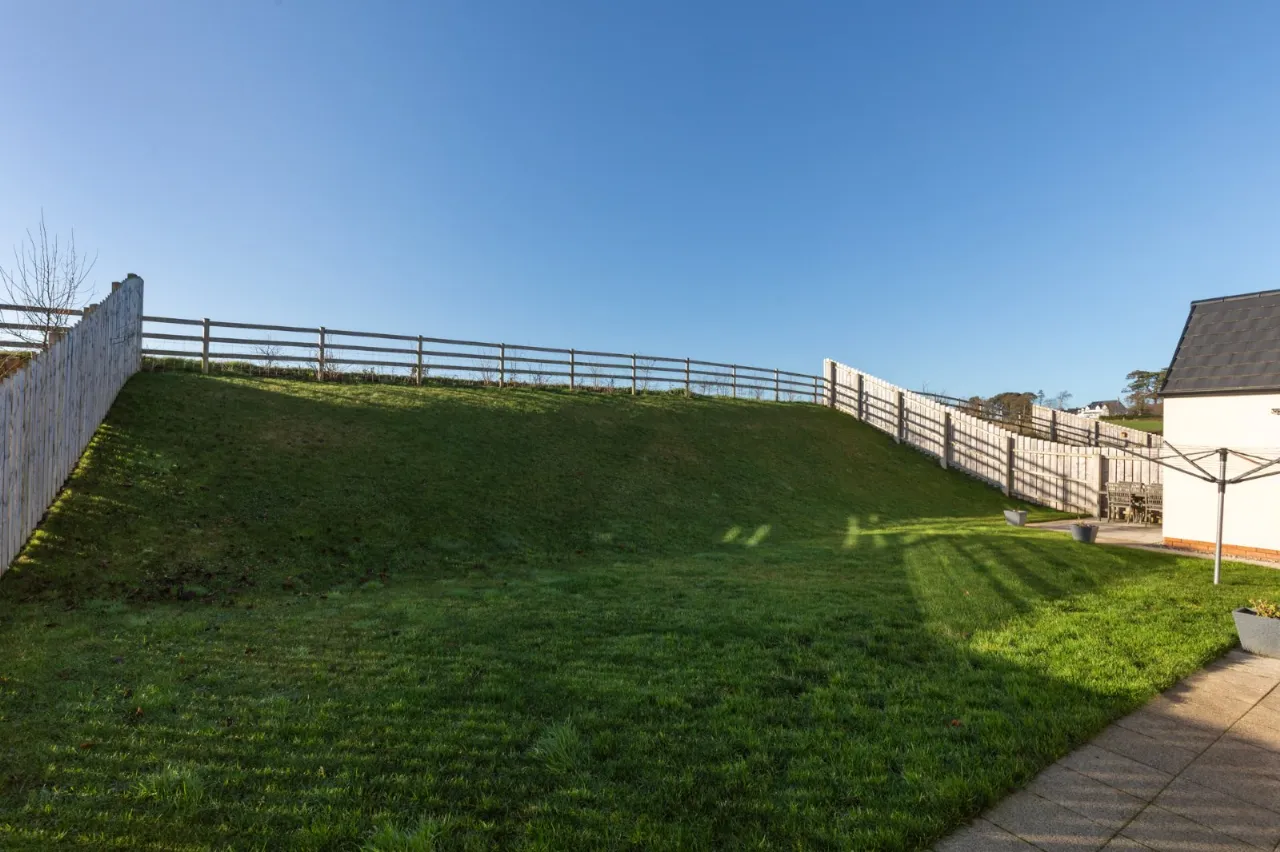 To front in ornamental lawn, shrub bed and paved path. Enclosed private garden to rear laid in manicured lawn, large, modern paved patios and paths, fencing, outside light, outside water tap, access to side for pedestrians, bins etc.