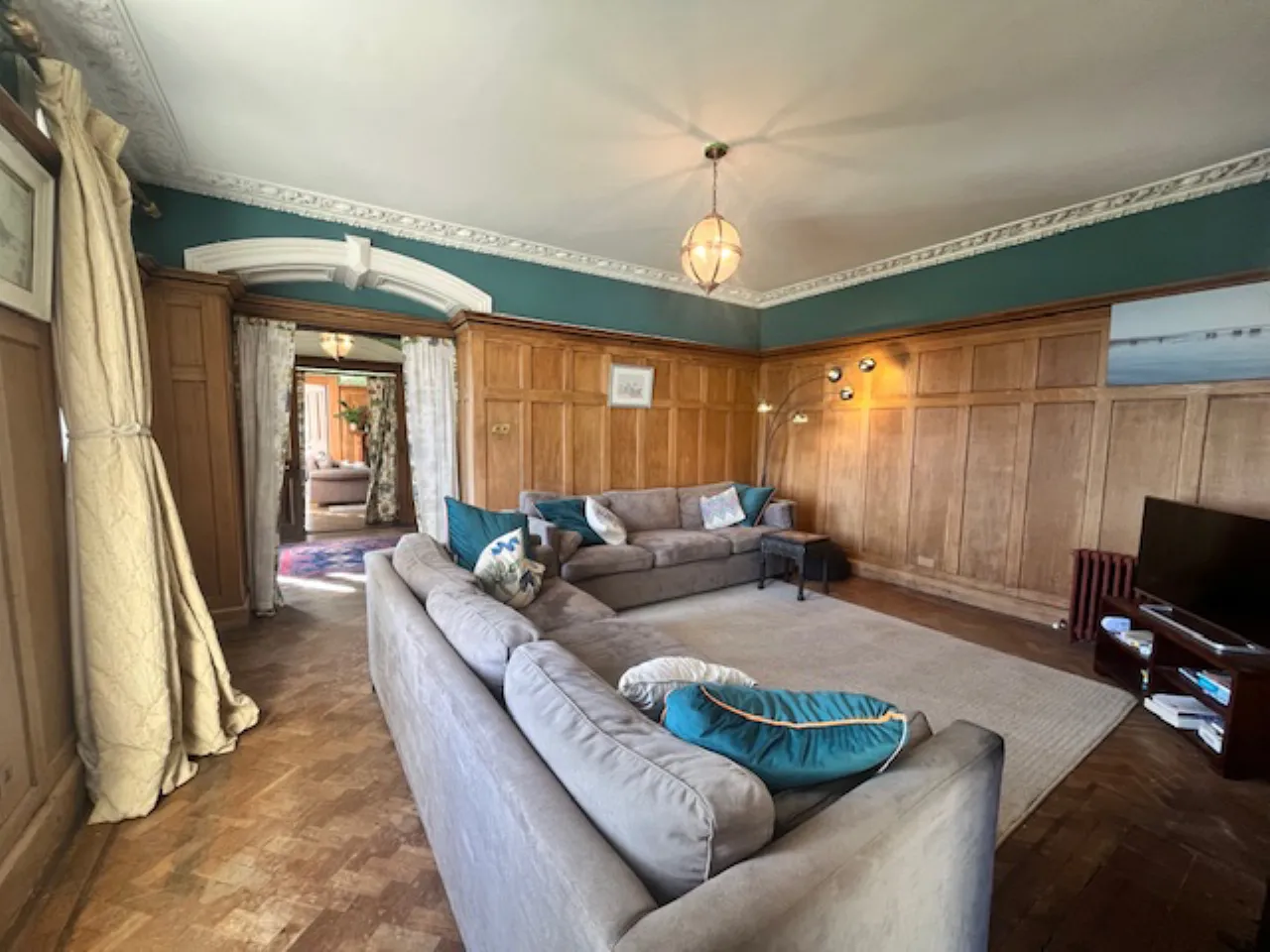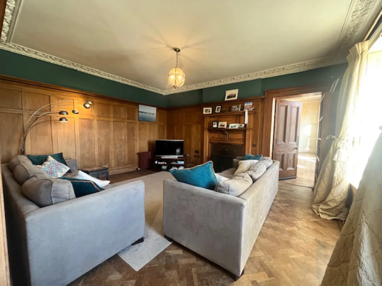 Glazed hardwood front door and glazed side panels. Parquet wooden floor. Wood panelling, corniced ceiling.