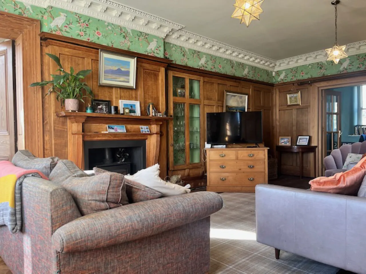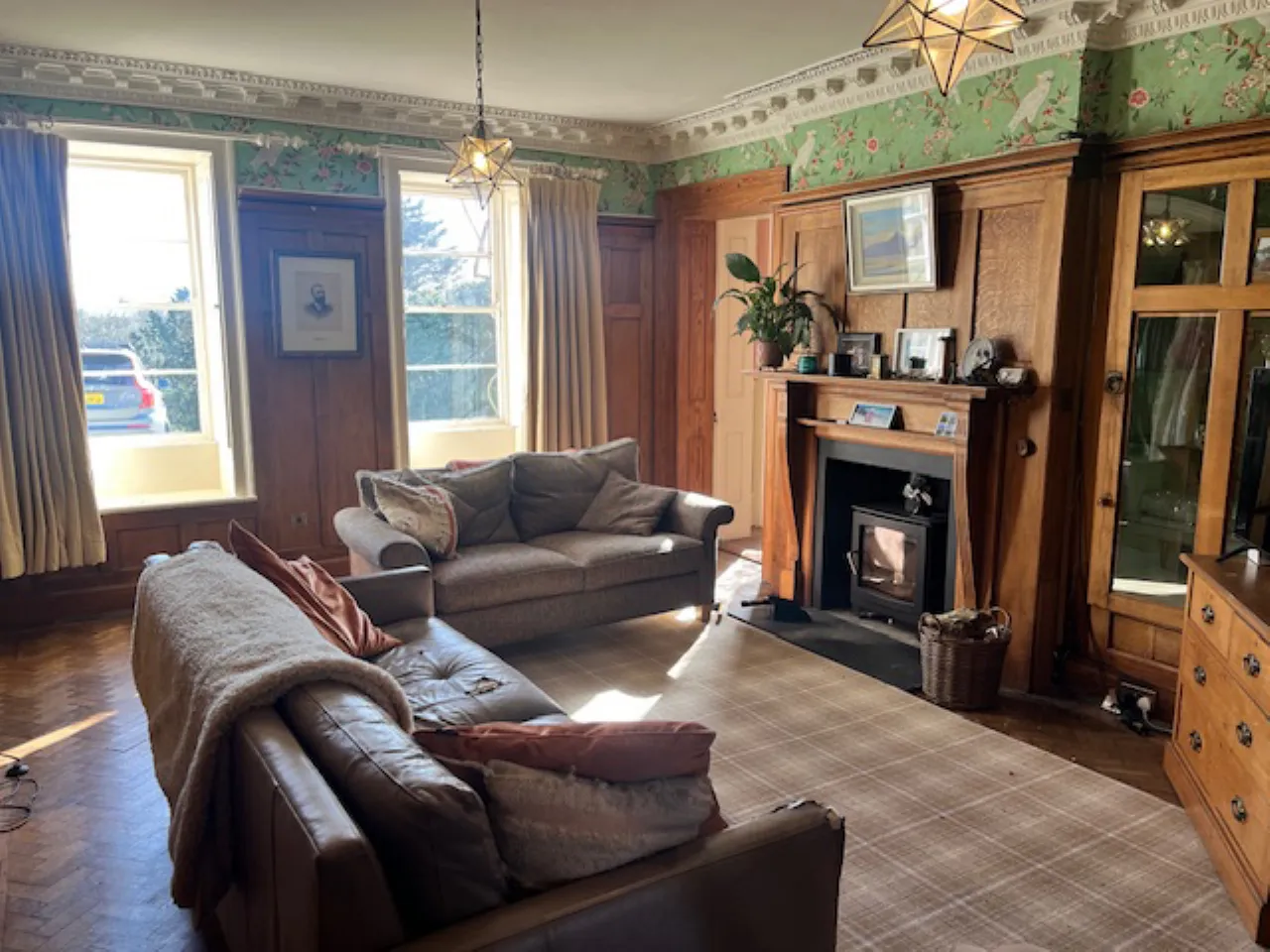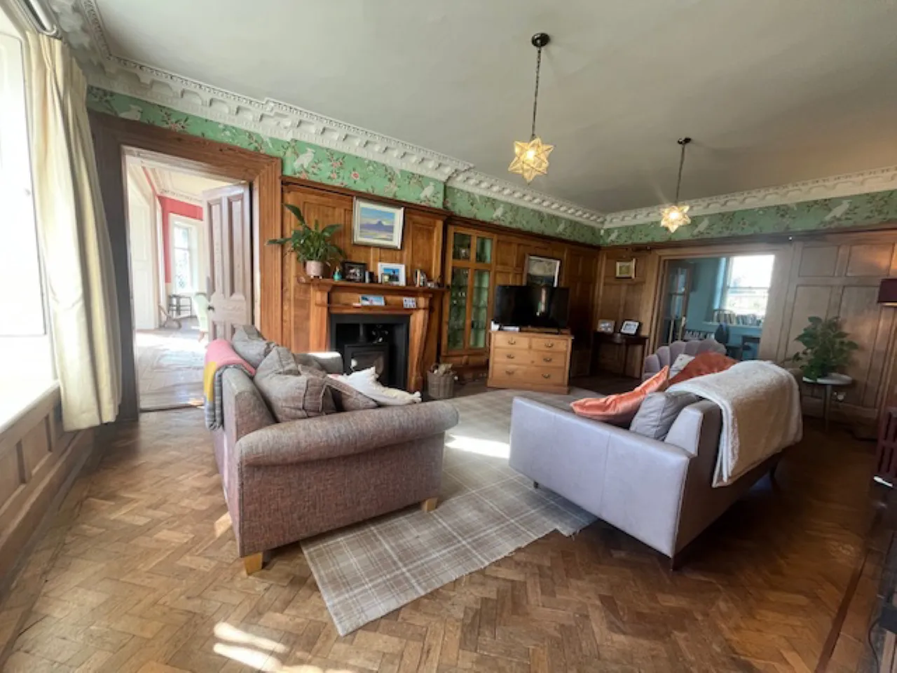 Parquet solid wood floor, wall panelling, corniced ceiling, open fire with carved wood surround, copper inset, tiled hearth.