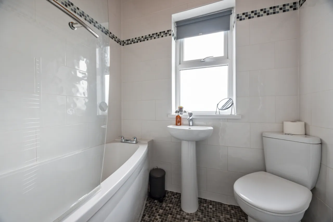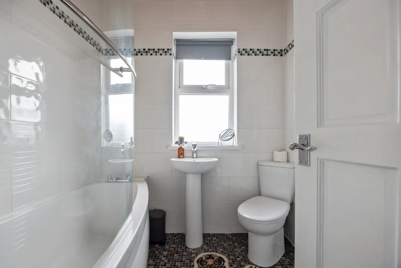 Low flush WC, pedestal wash hand basin with mixer taps, ceramic tiled floor, gas boiler.
