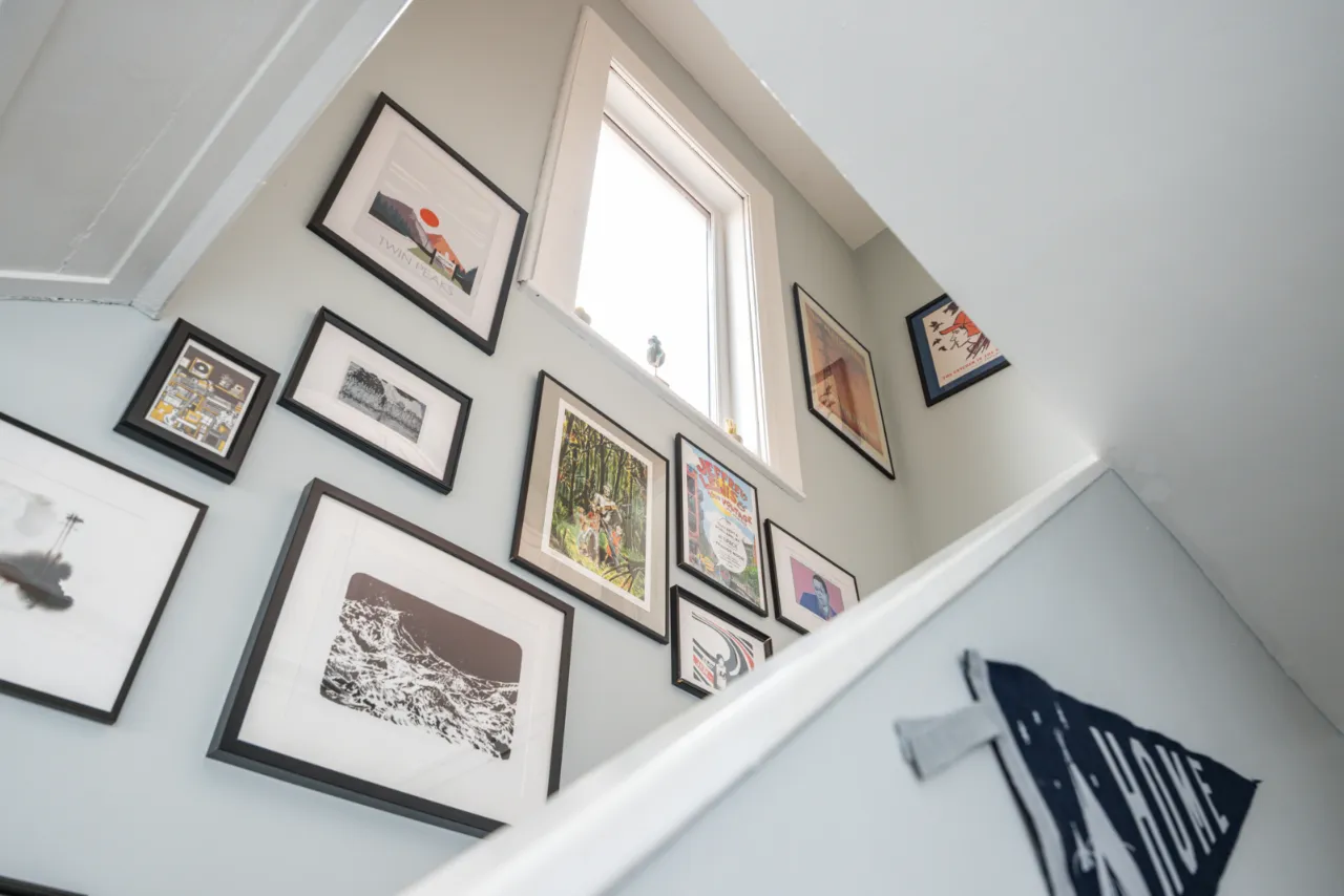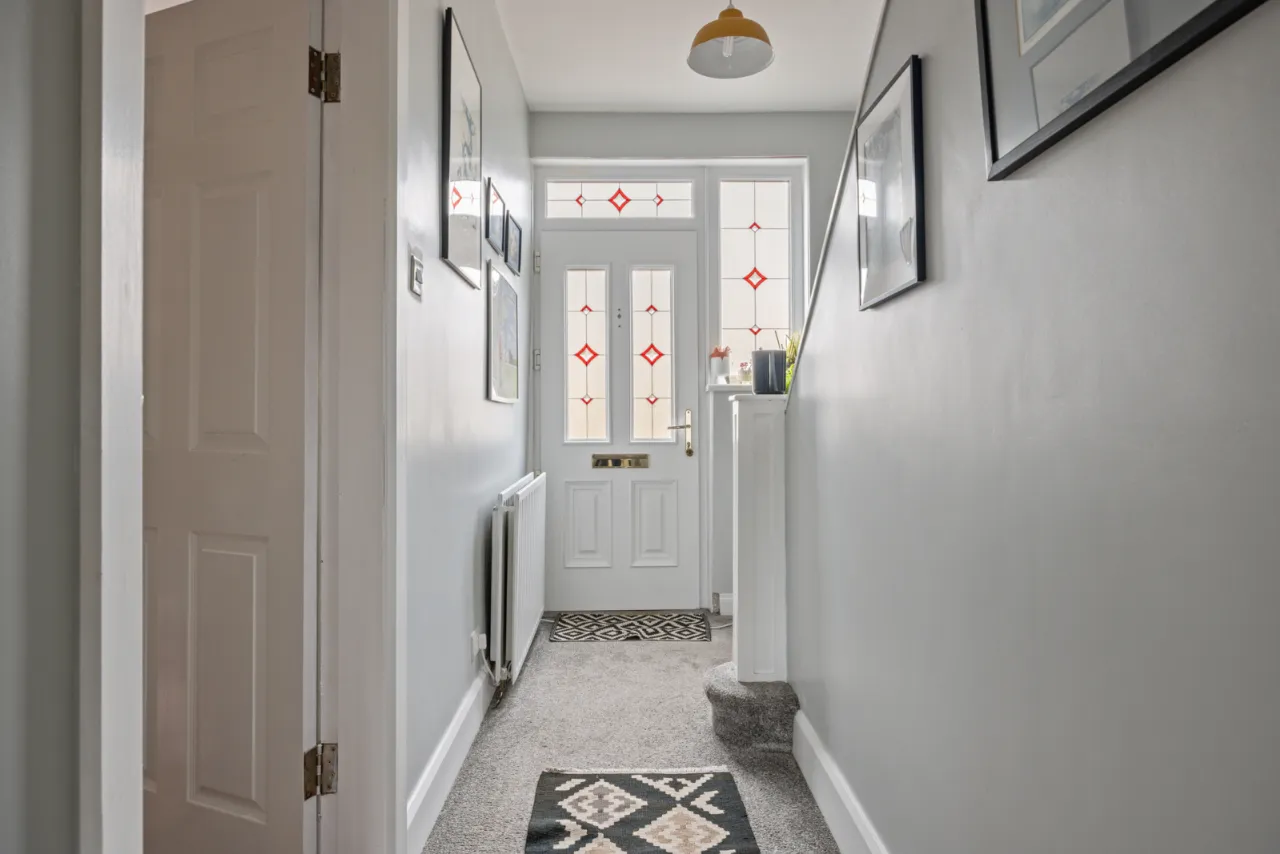 PVC Entrance door with leaded stained glass panels. Under stairs storage.