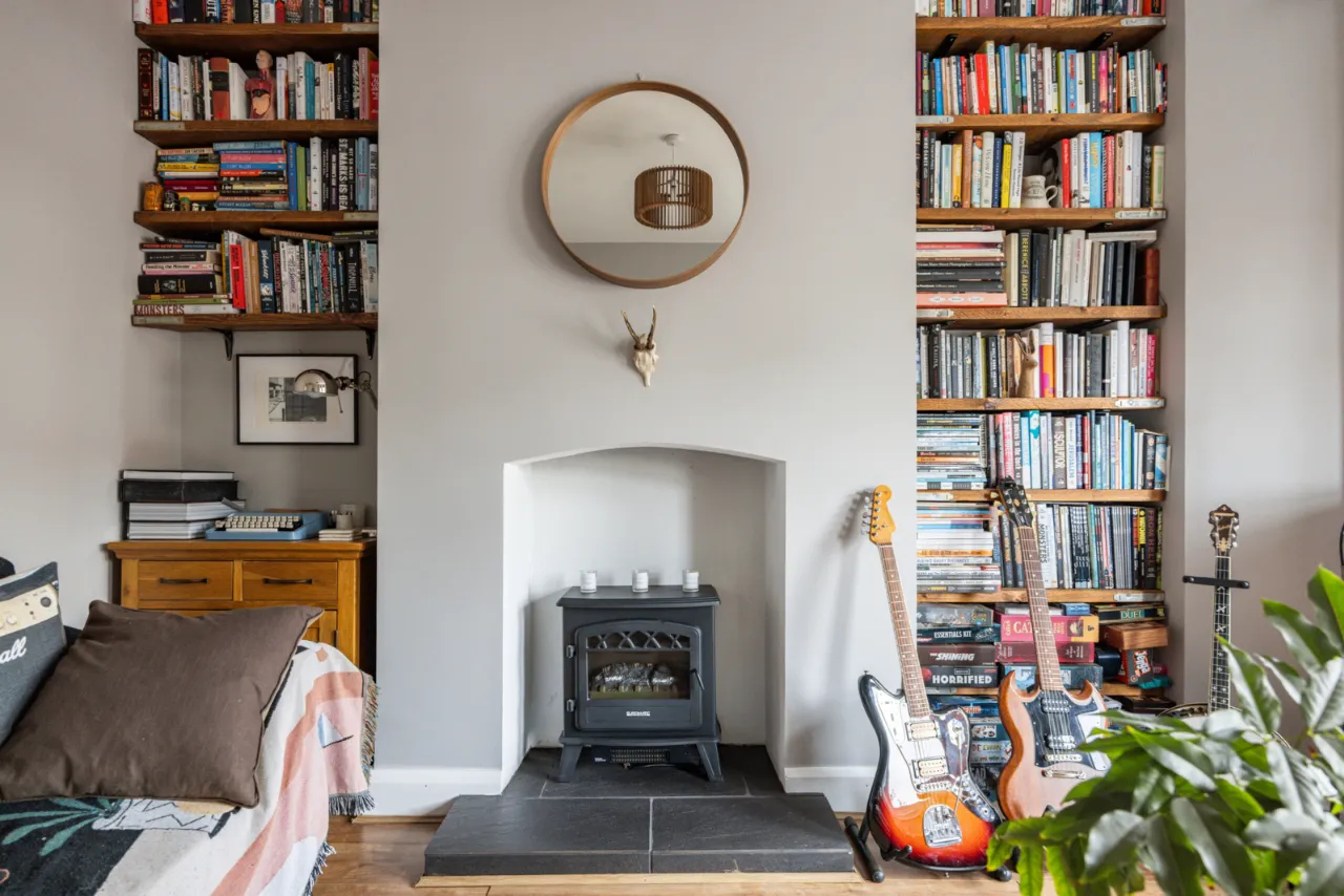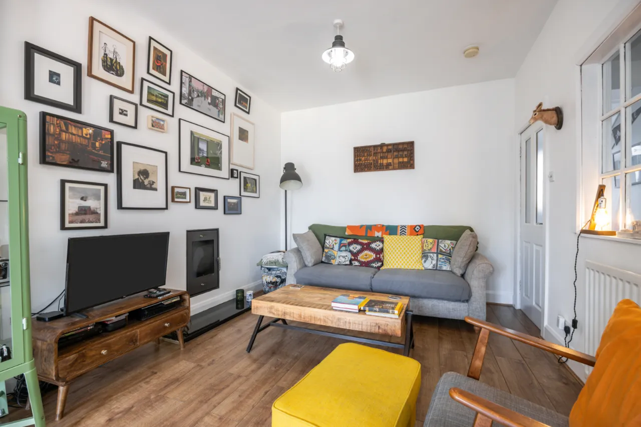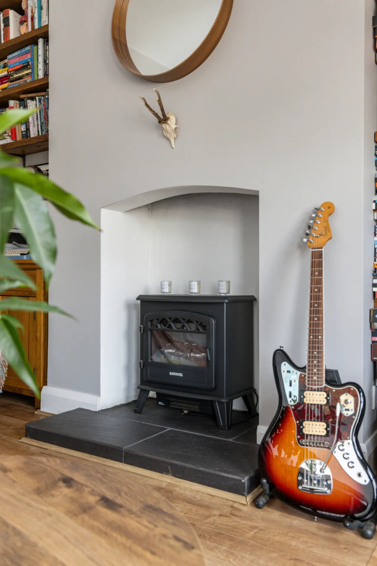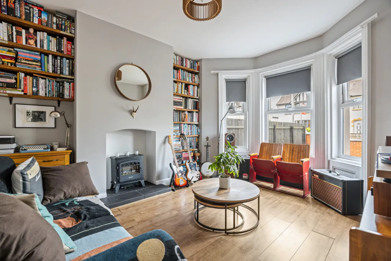 Electric fire, laminate wood flooring, bay window.