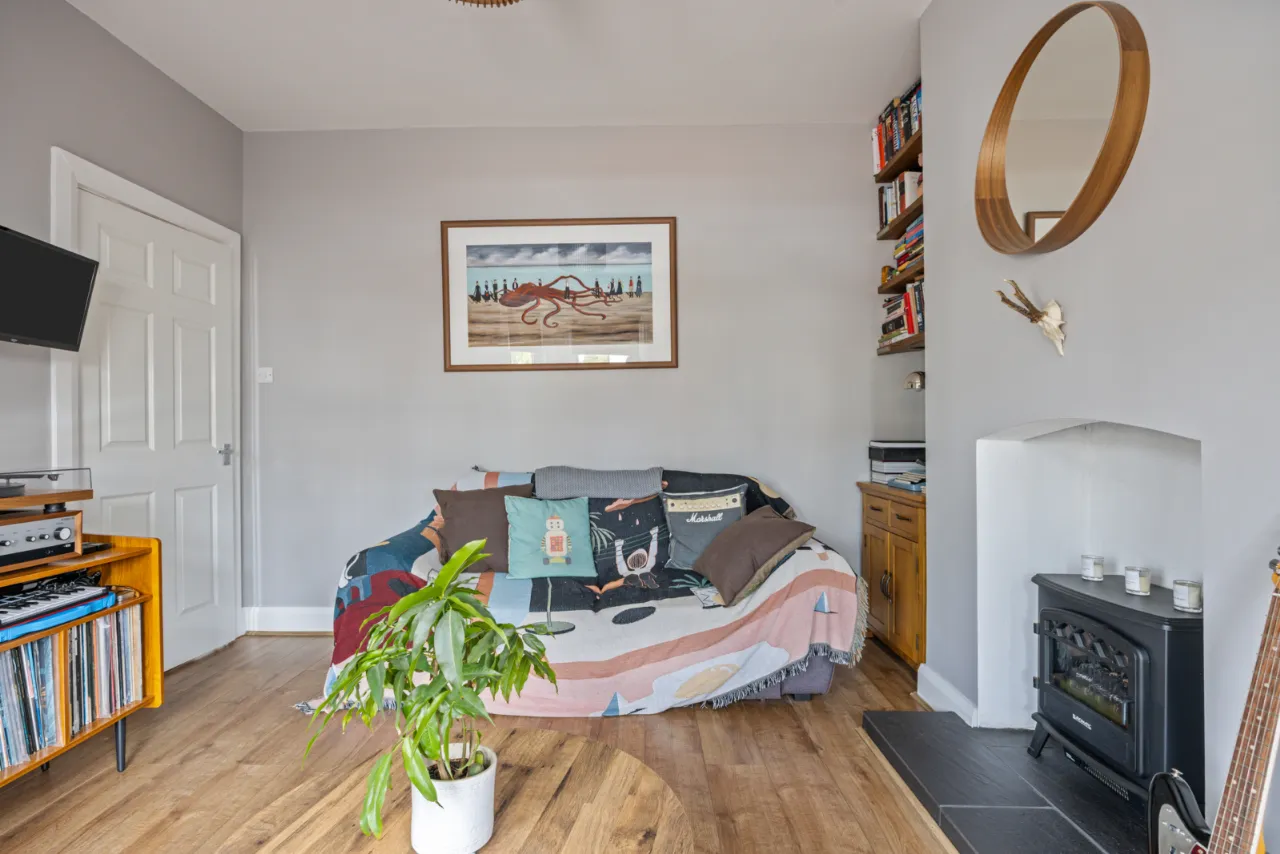 Glass fronted wood burning stove, wood laminate flooring, French double doors to rear.
