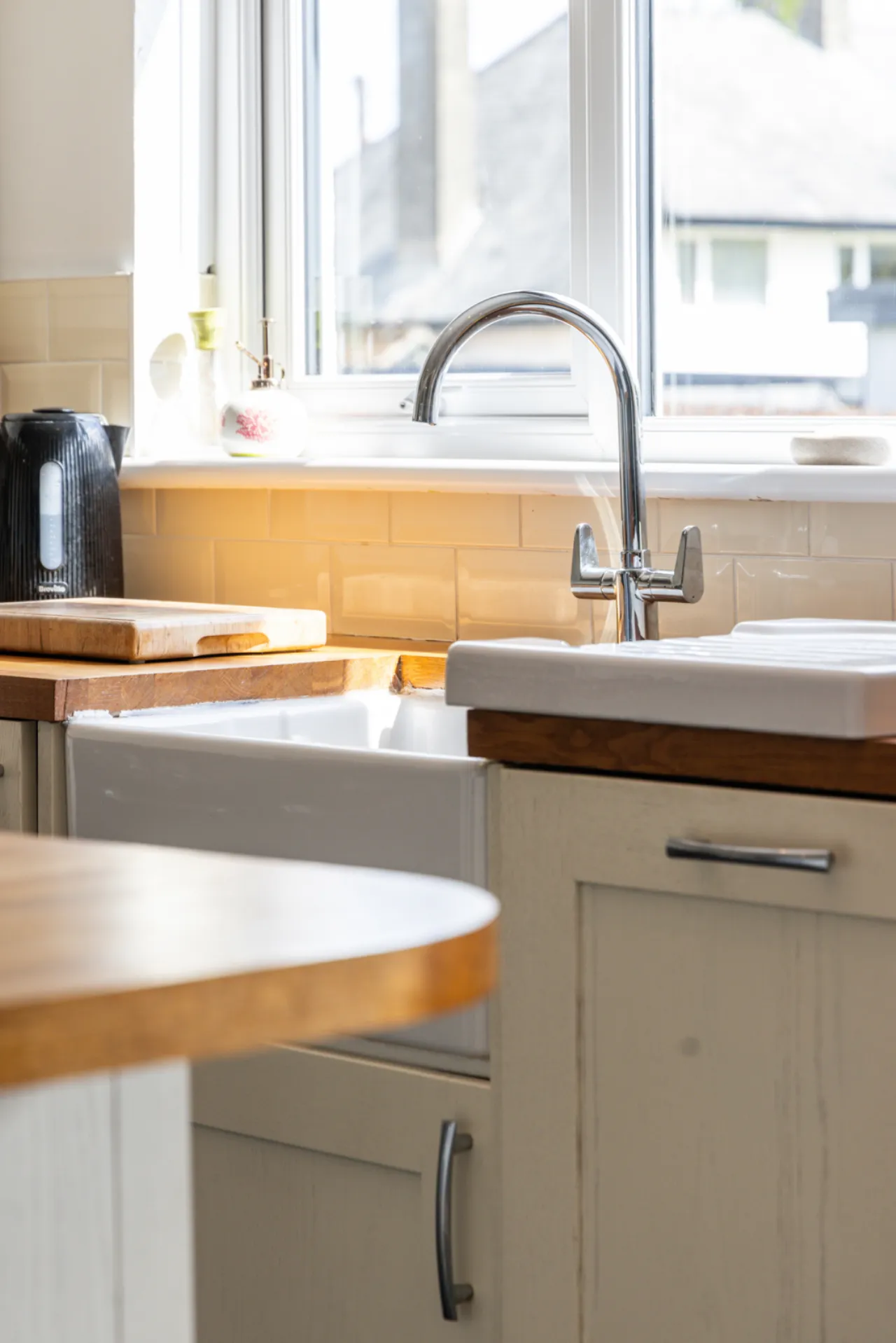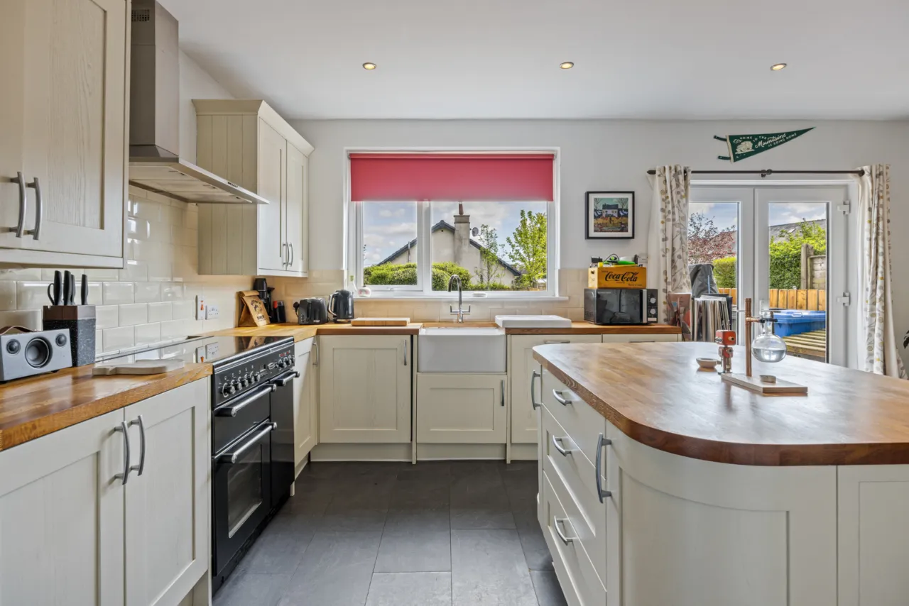 Full range of high and low level units with oak work surfaces, recess for cooker, Belfast sink with mixer taps, built in dishwasher, partly tiled walls, central island with oak work surfaces, open to: