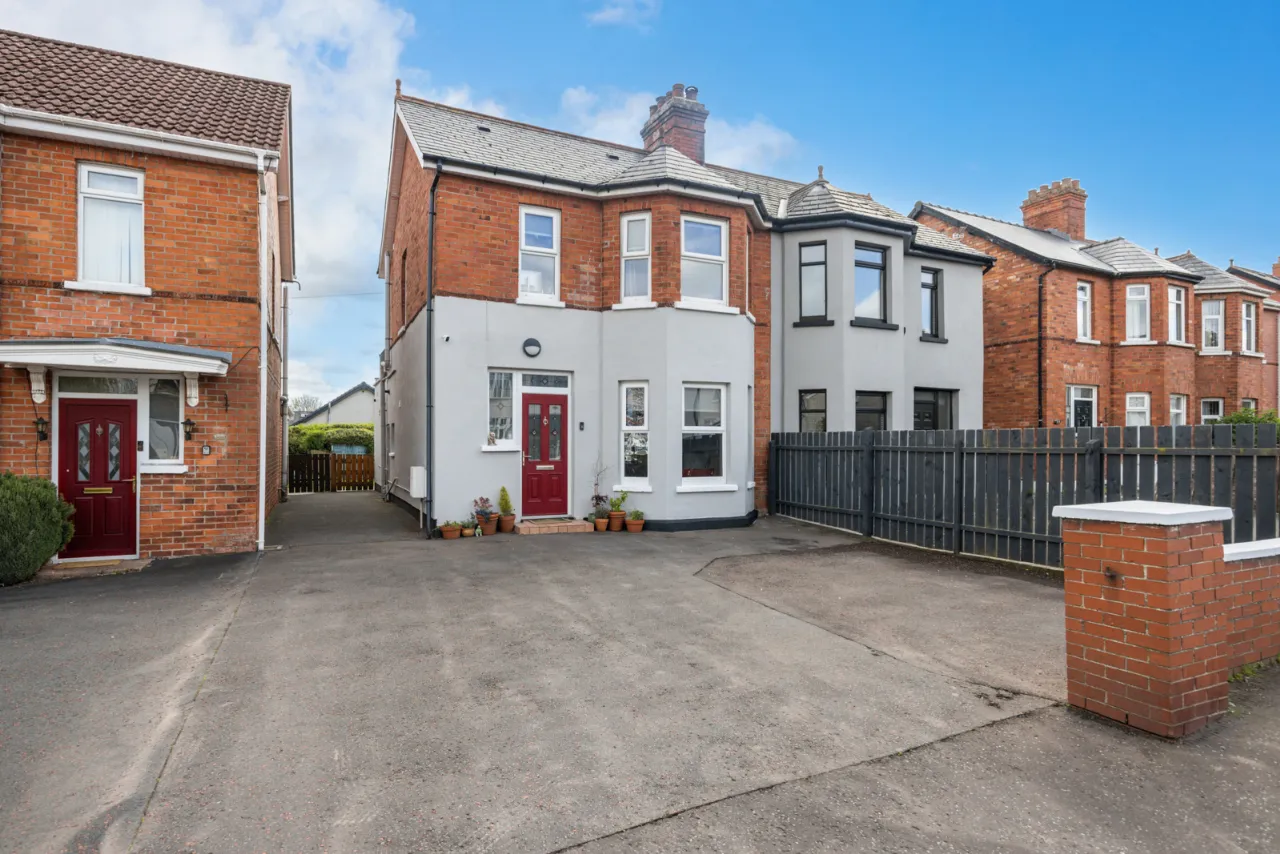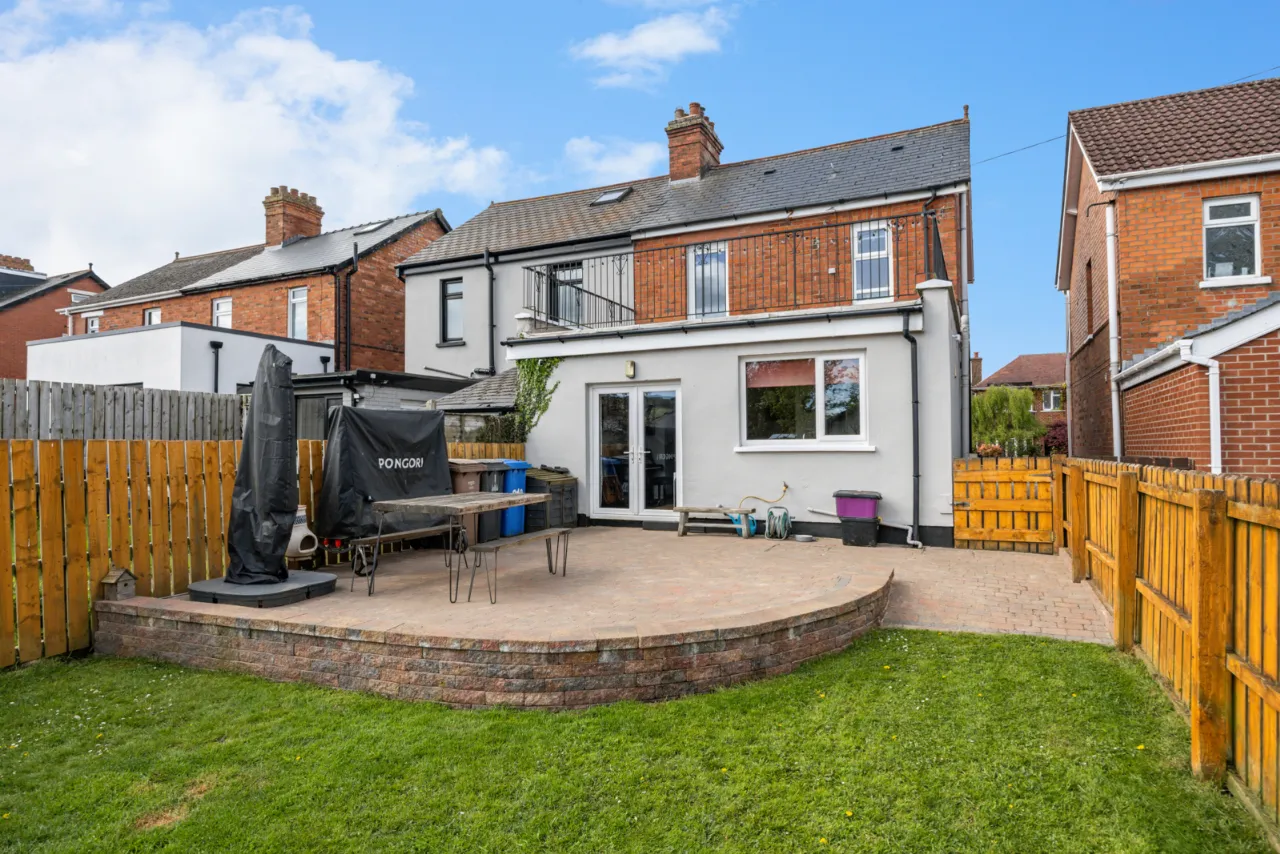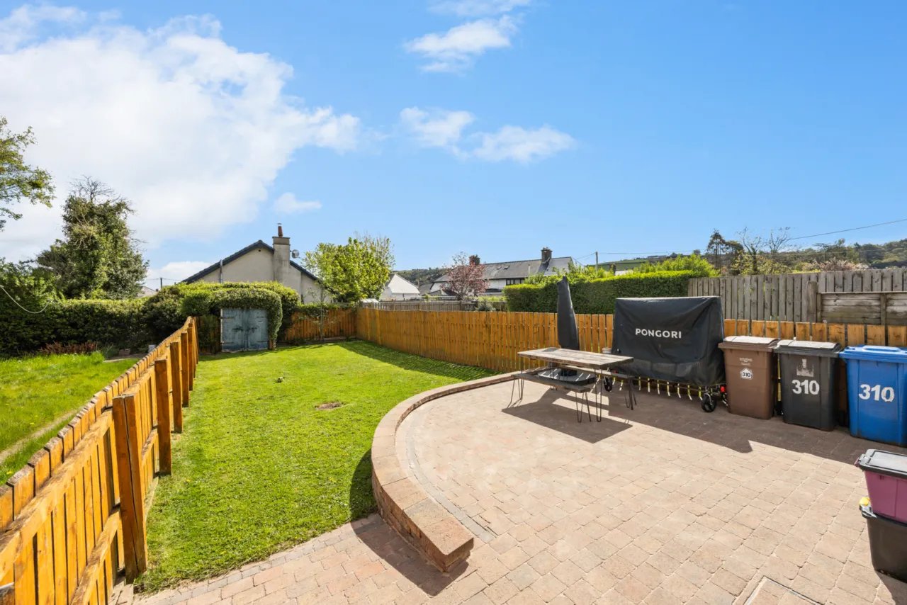 To the front is parking for 2 cars and a shared side driveway. To the rear is a paved patio and large garden laid in lawn.