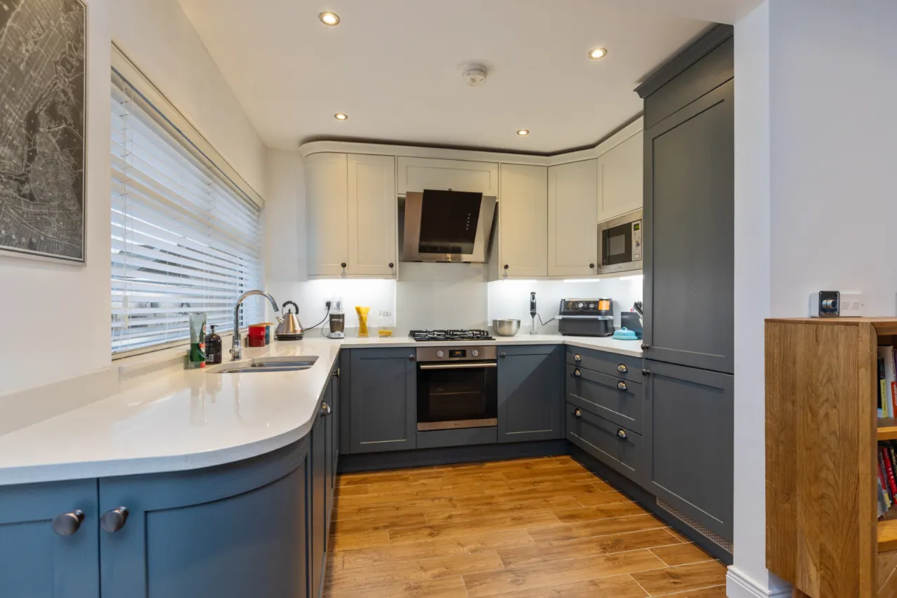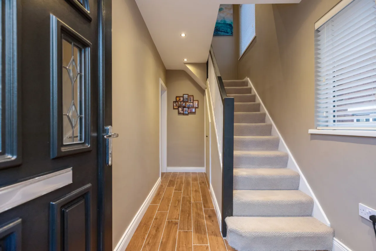 Tiled wood effect flooring, recessed spotlighting, storage below stairs with combi gas boiler, Hive heating system.
