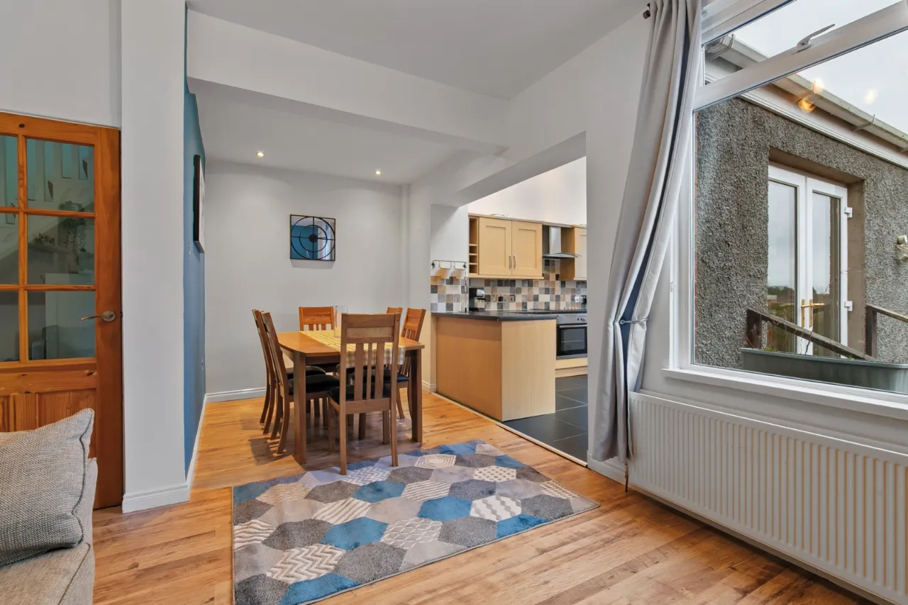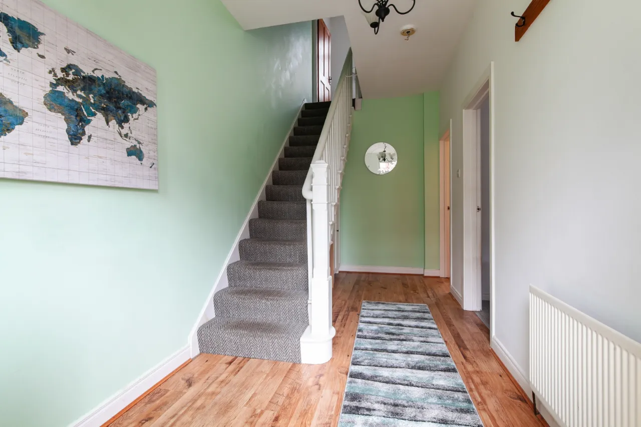 Overlooks the rear garden and houses the gas boiler within a cupboard.