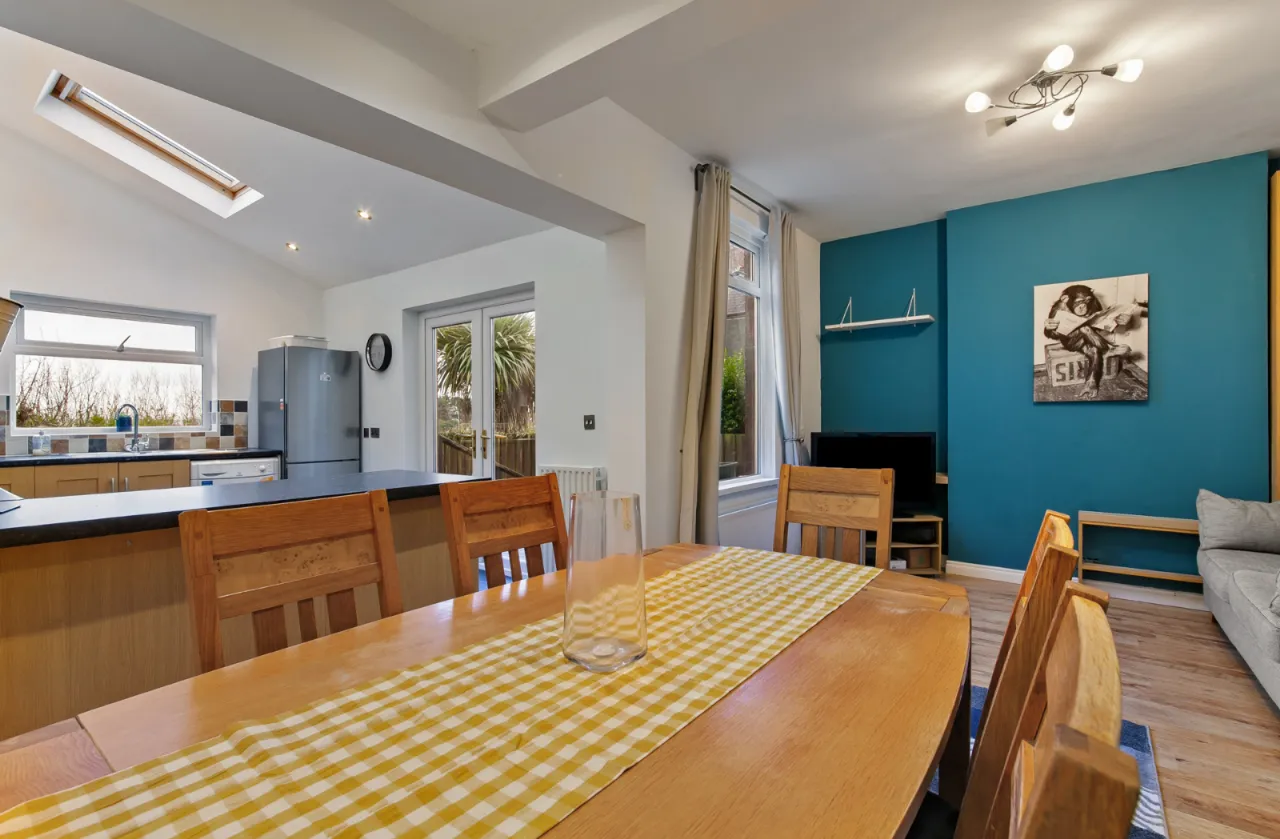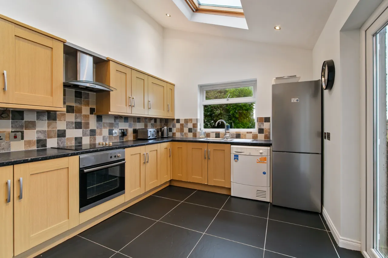 Providing an excellent space for modern family living and entertaining. The kitchen is fitted with a range of high-level and low-level units with laminated work surfaces, built-in electric oven and hob with stainless steel extractor fan, space for a fridge/freezer, dishwasher and washing machine. A skylight window and recessed lighting add to the bright and contemporary feel, while double patio doors open directly onto the south-facing rear garden.