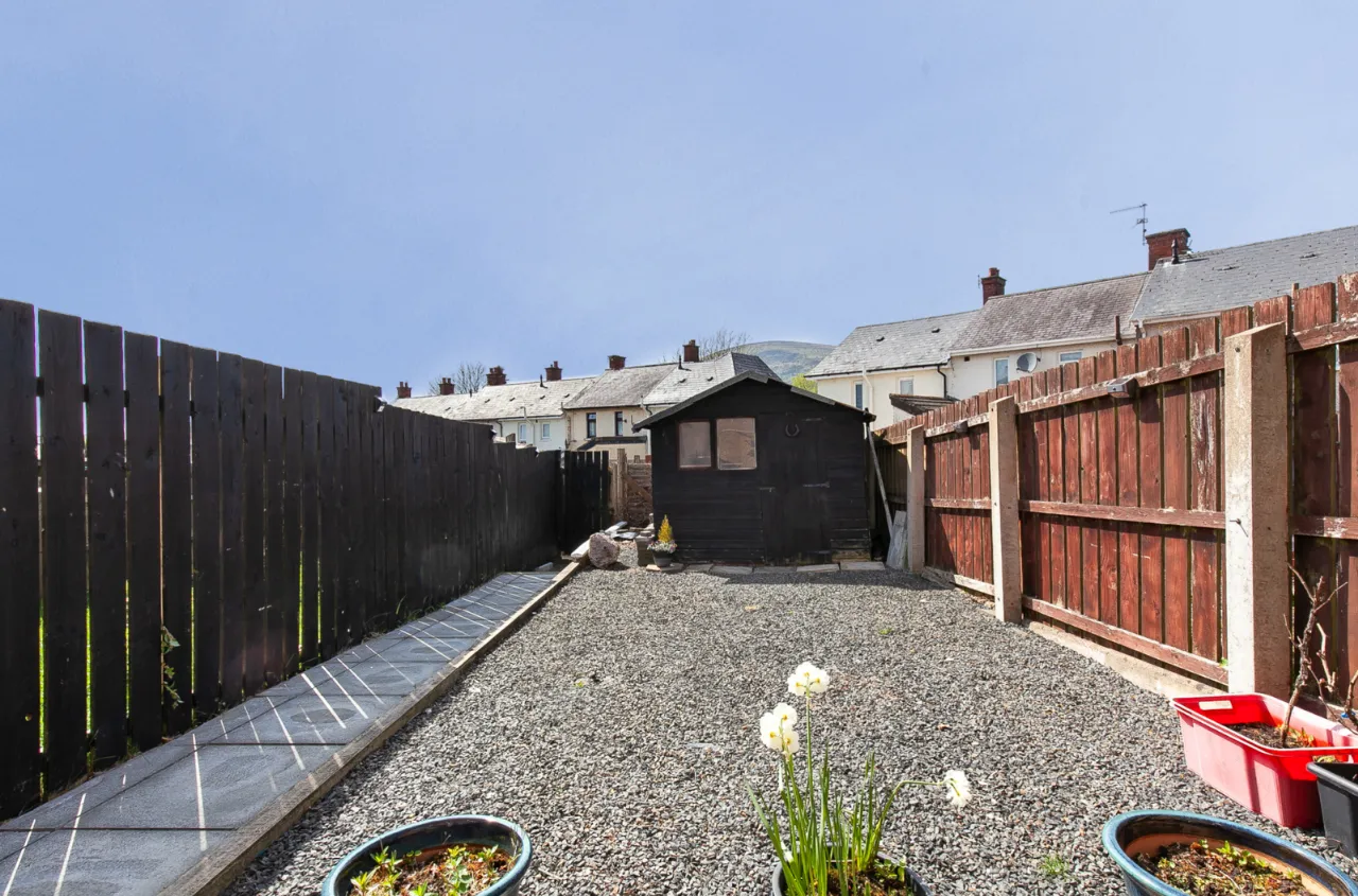 Front lawn and pathway. Rear south facing patio, shed, gate for rear access and outside tap.