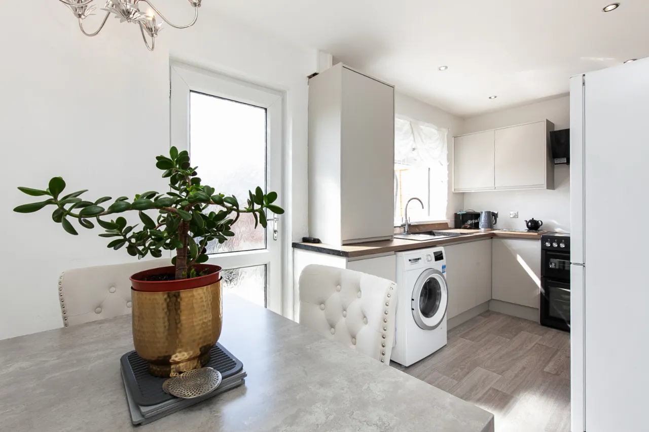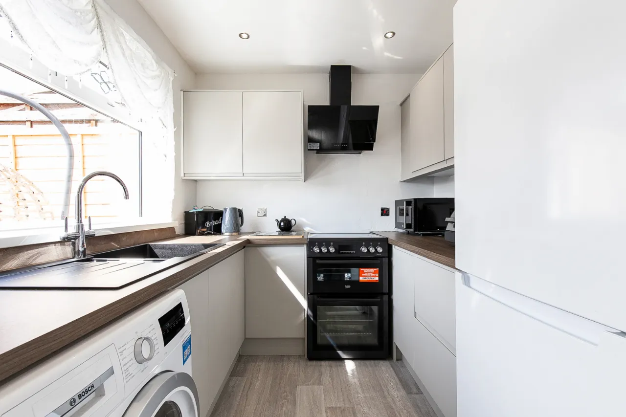 New Kitchen with a range of high and low level units, sink with mixer tap and drainer. Electric oven and hob with overhead extractor unit. Gas combi boiler, washing machine and laminate floor.