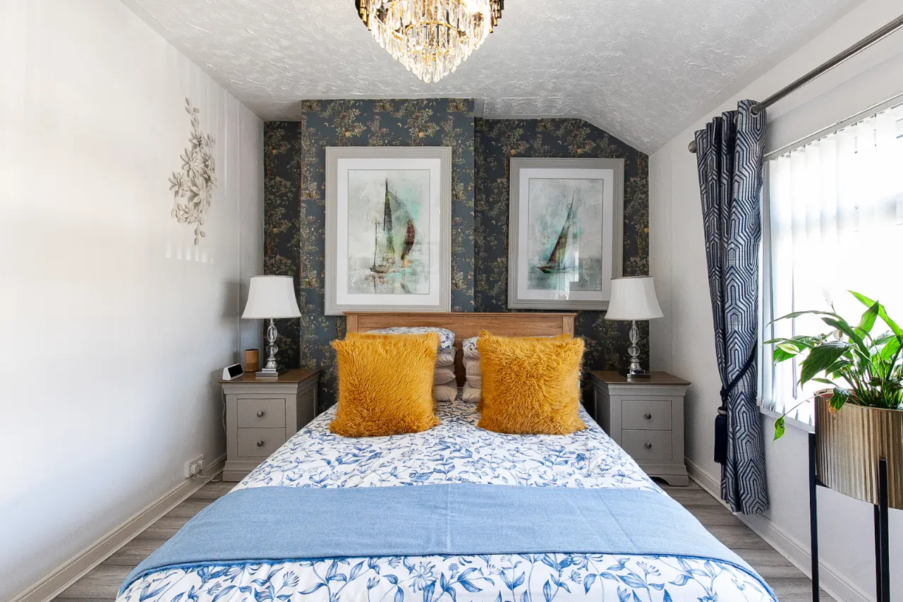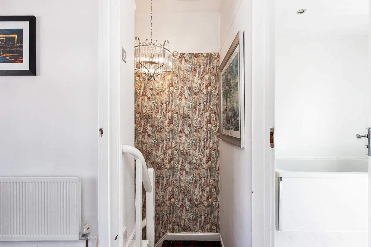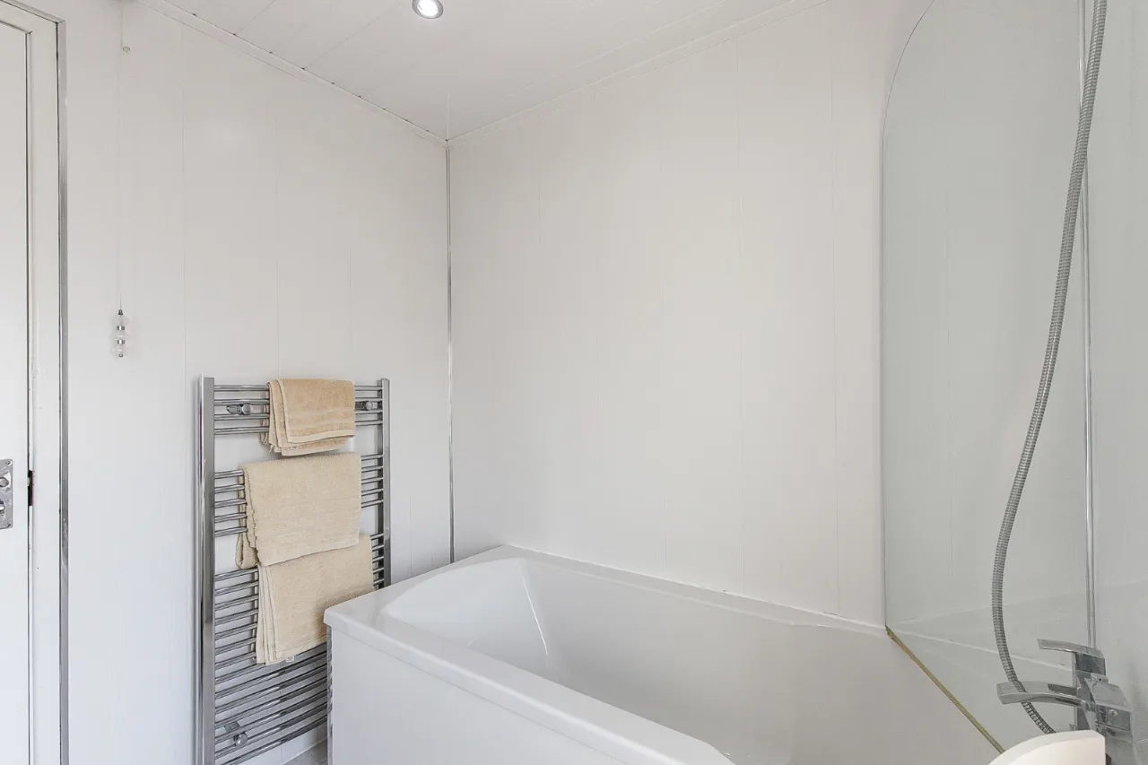 Upstairs, the property comprises two generous bedrooms, both benefiting from built-in storage, along with a contemporary, recently refurbished family bathroom. Additional storage is available via a floored roof space with lighting.