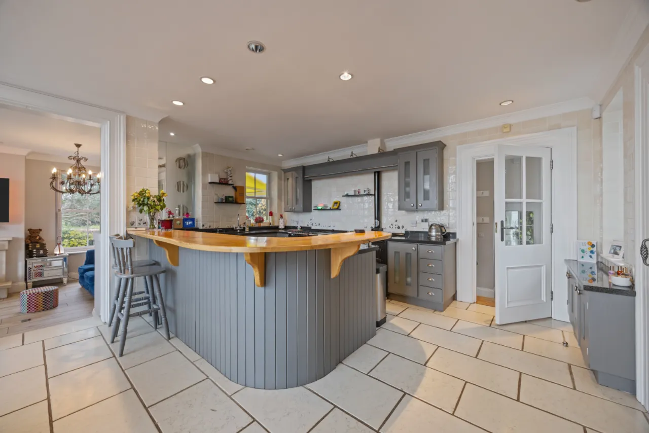 Accessed via three double opening hardwood doors. Natural stone fireplace, mantle piece and hearth with natural brick inset, open dog basket and gas fire. Feature curved glazed wall overlooking kitchen area. Panoramic views over Belfast Lough. Windows to side garden with shutters. Sliding glazed door to morning sun patio and BBQ area. Wood effect tiled floor.