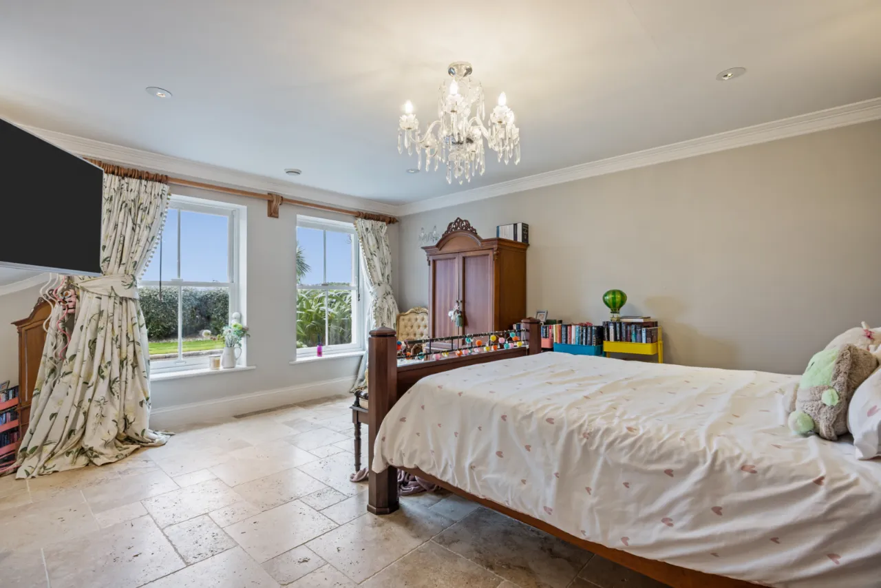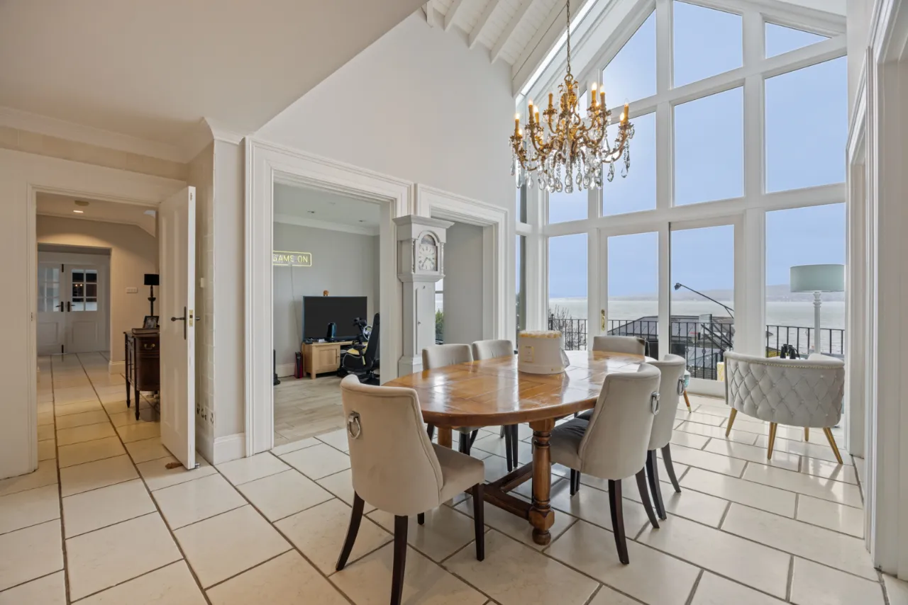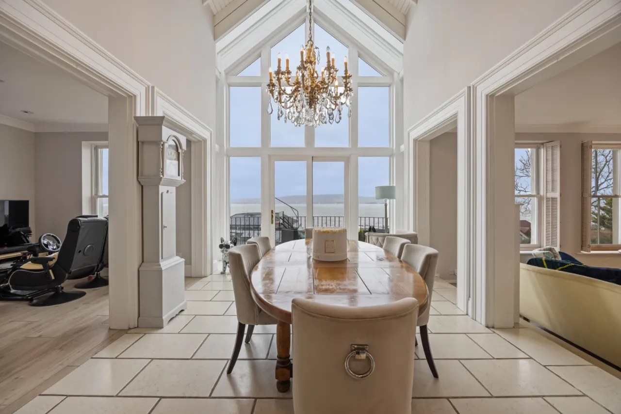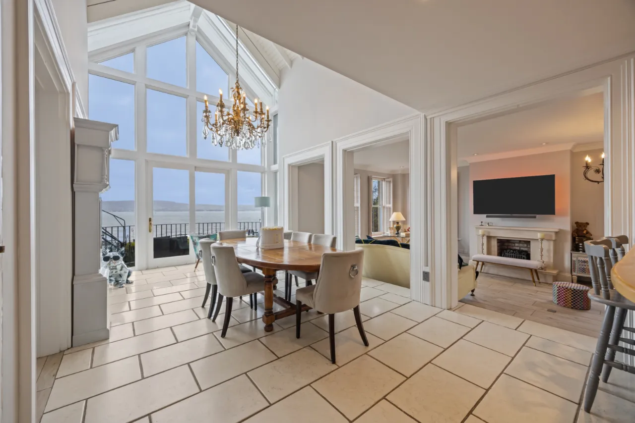 Double height ceiling extending to 20’ 0” (6.1m) with eaves ceiling. Open to first floor minstrel gallery. Triple height full width windows overlooking gardens and Belfast Lough. Sliding door to crescent balcony with seating and BBQ area. Television point and lighting over. Ample seating for 8-10 seater dining table and chairs. Open to...