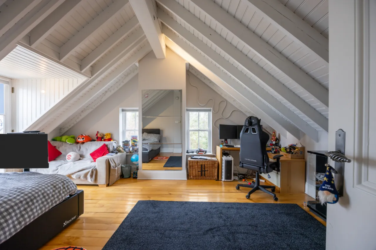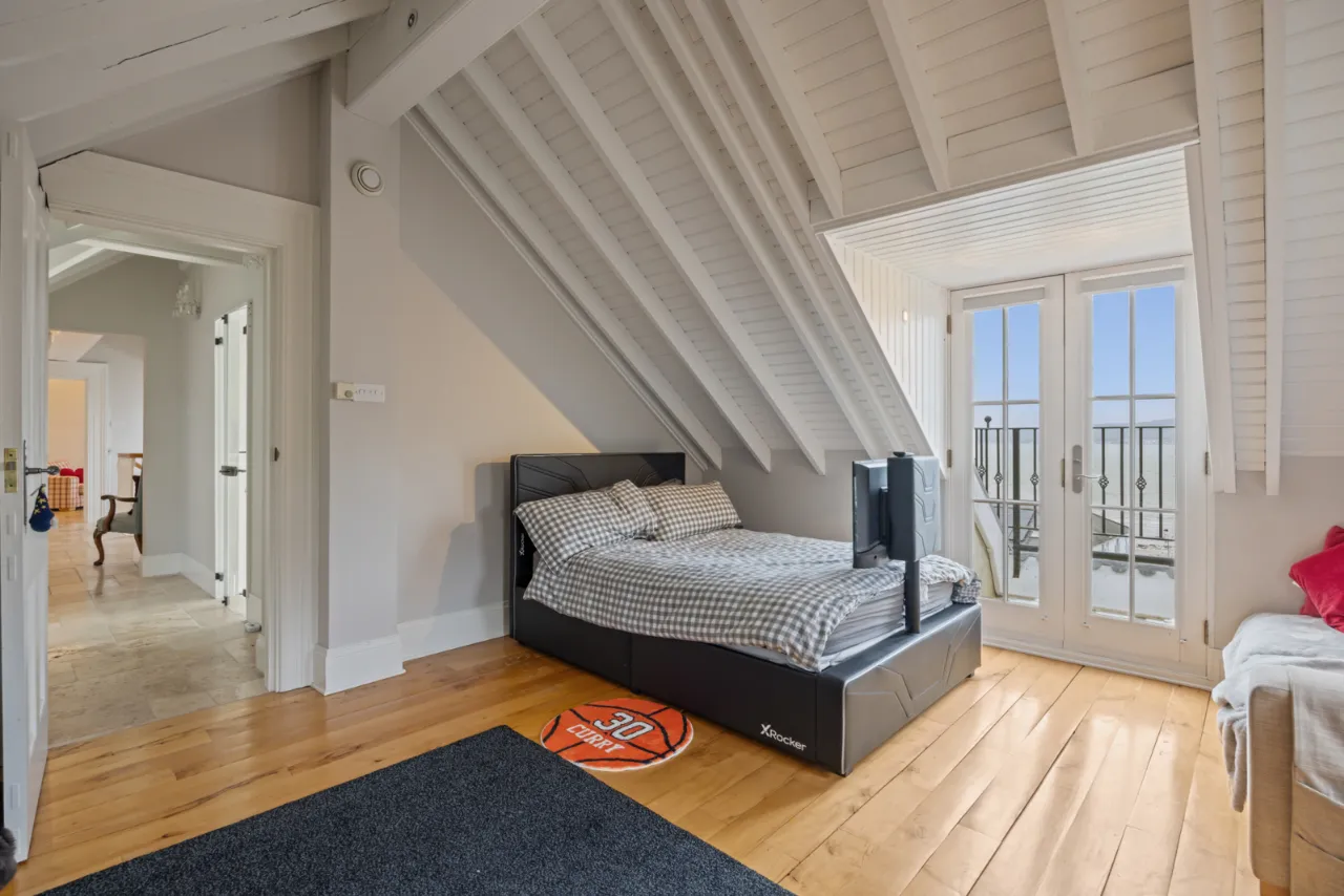 Bedroom Area: New England style eaves ceiling with exposed beams. Natural stone tiled floor. Double window overlooking Belfast Lough and the Co. Antrim hills and beyond.