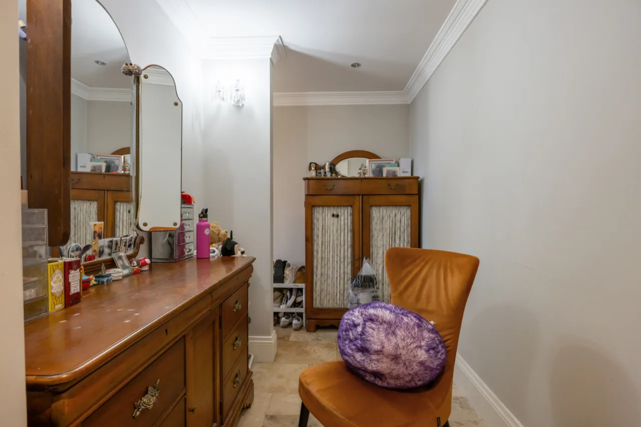 Dressing area with excellent selection of cupboards, drawers and shelves. Natural stone tiled floor. Open storage. Glazed display units. Access to..
