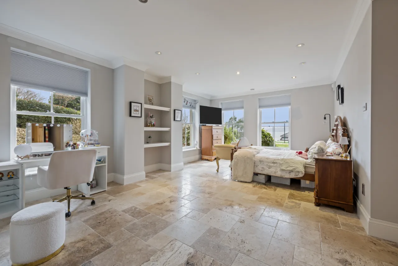 at widest points. Corniced ceiling. Low voltage lighting. Views across Belfast Lough to the Co. Antrim hills. Double built-in wardrobes with excellent shelving and hanging space.