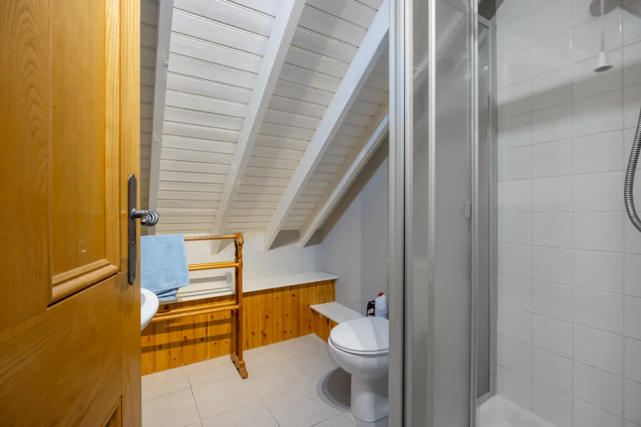 Low flush WC. Wash hand basin in vanity unit with built-in storage and open storage. Natural stone top and built-in mirror. Fully tiled walls. Stone tiled floor. Low voltage lighting. Wet room style shower with thermostatic shower.