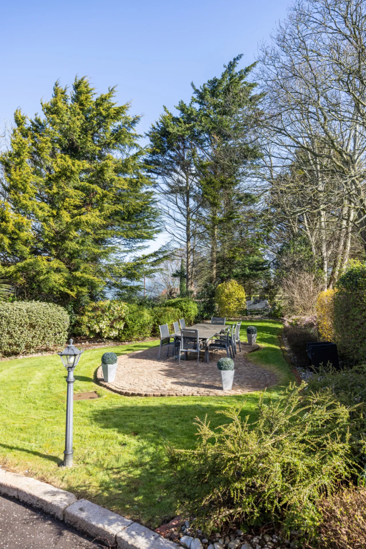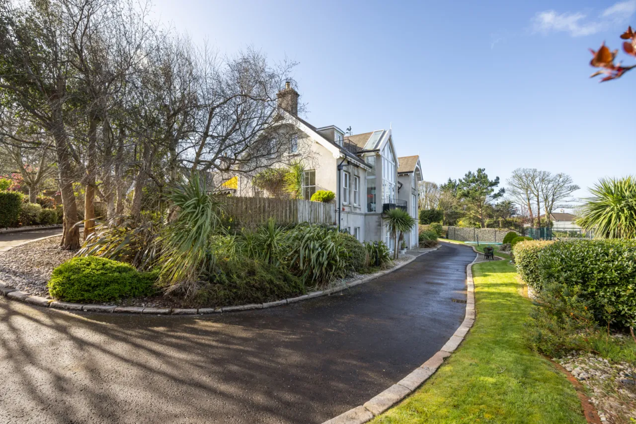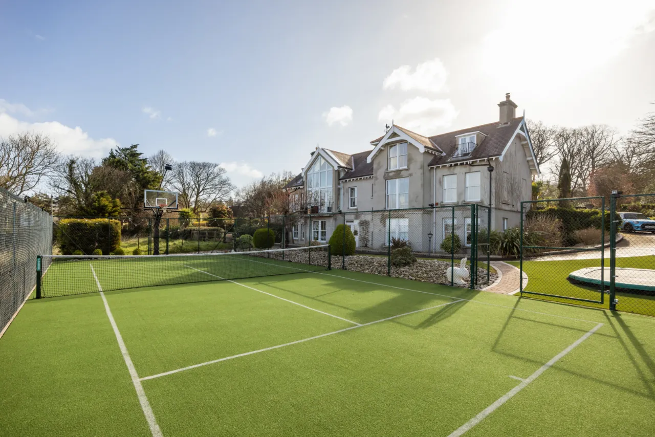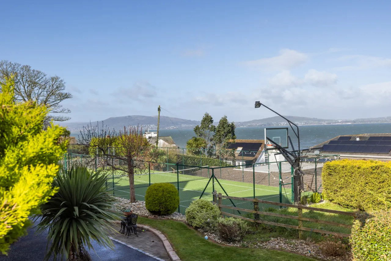 Approached by private screened wall with natural brick top, double entrance pillars and electric gates leading into wrap around driveway with solid granite trim with extensive parking and turning space. Landscaped gardens laid in lawns with a colourful array of flowerbeds with shrubs, plants and mature trees. Range of patios for morning, afternoon and evening sun. Two storage sheds. Carport with door to garage. Pedestrian access to Circular Road West via secure gate. Bin store area. Outside tap and lighting. Stunning views across Belfast Lough and the Co. Antrim hills. Full sized tennis court and putting green.
