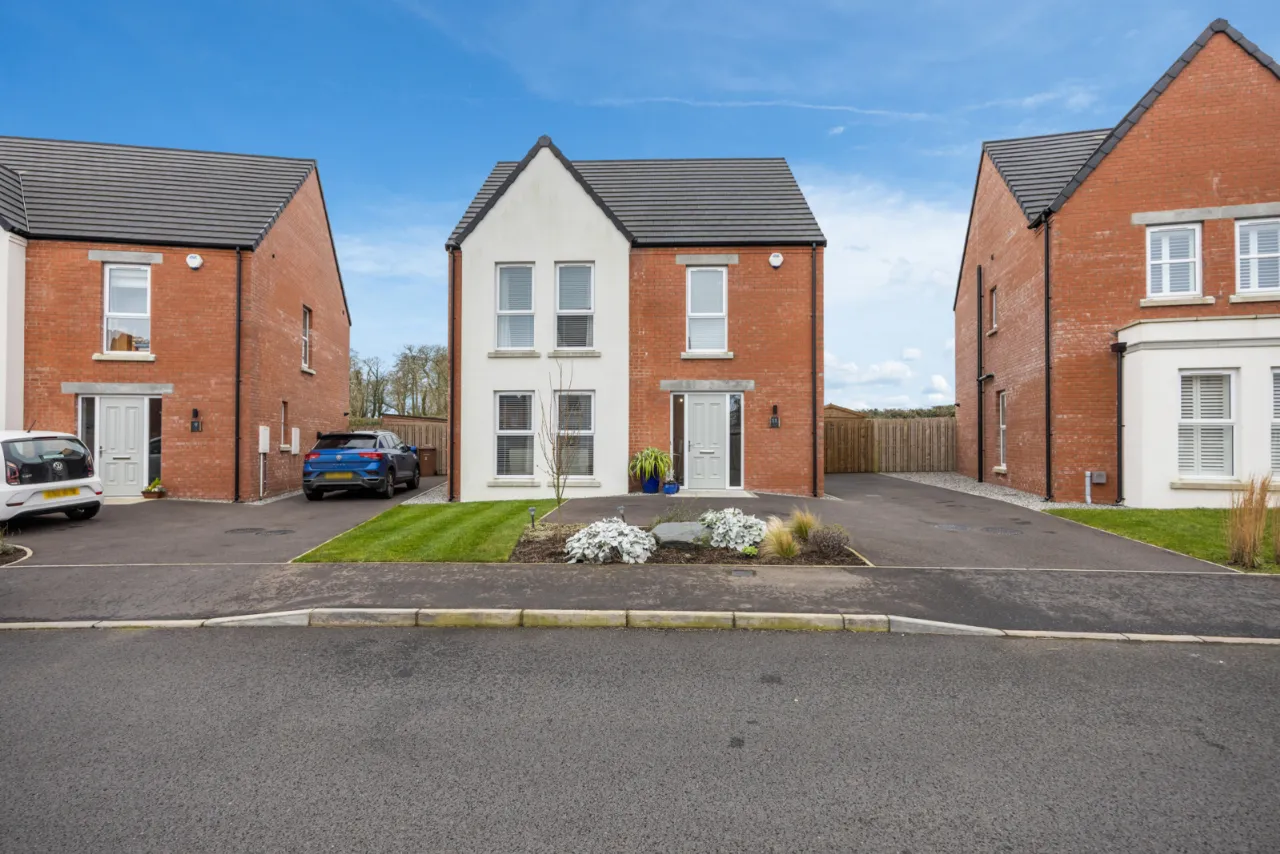 Tarmac driveway providing off street parking for four cars, front garden laid in lawns with flowerbeds in plants and shrubs.