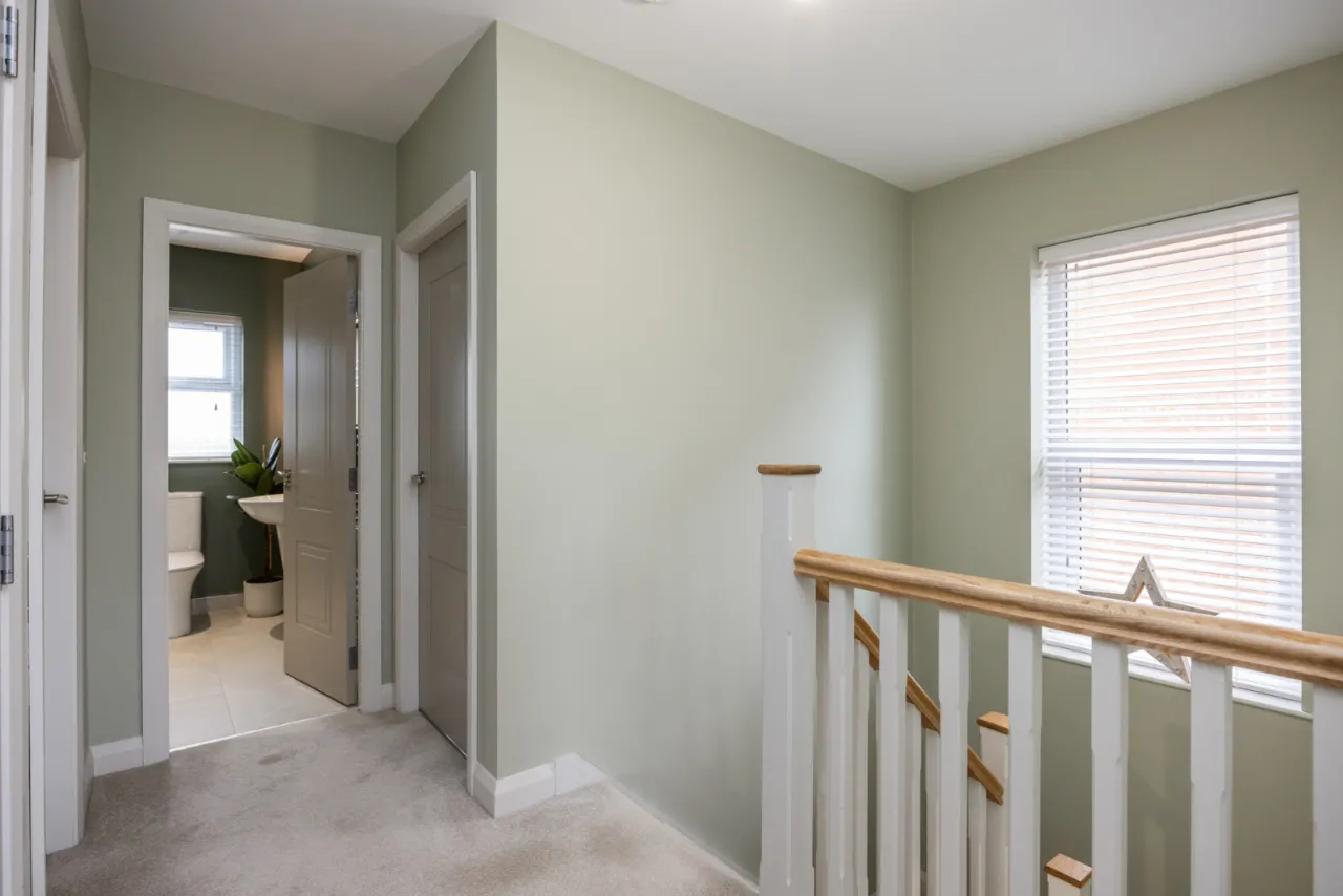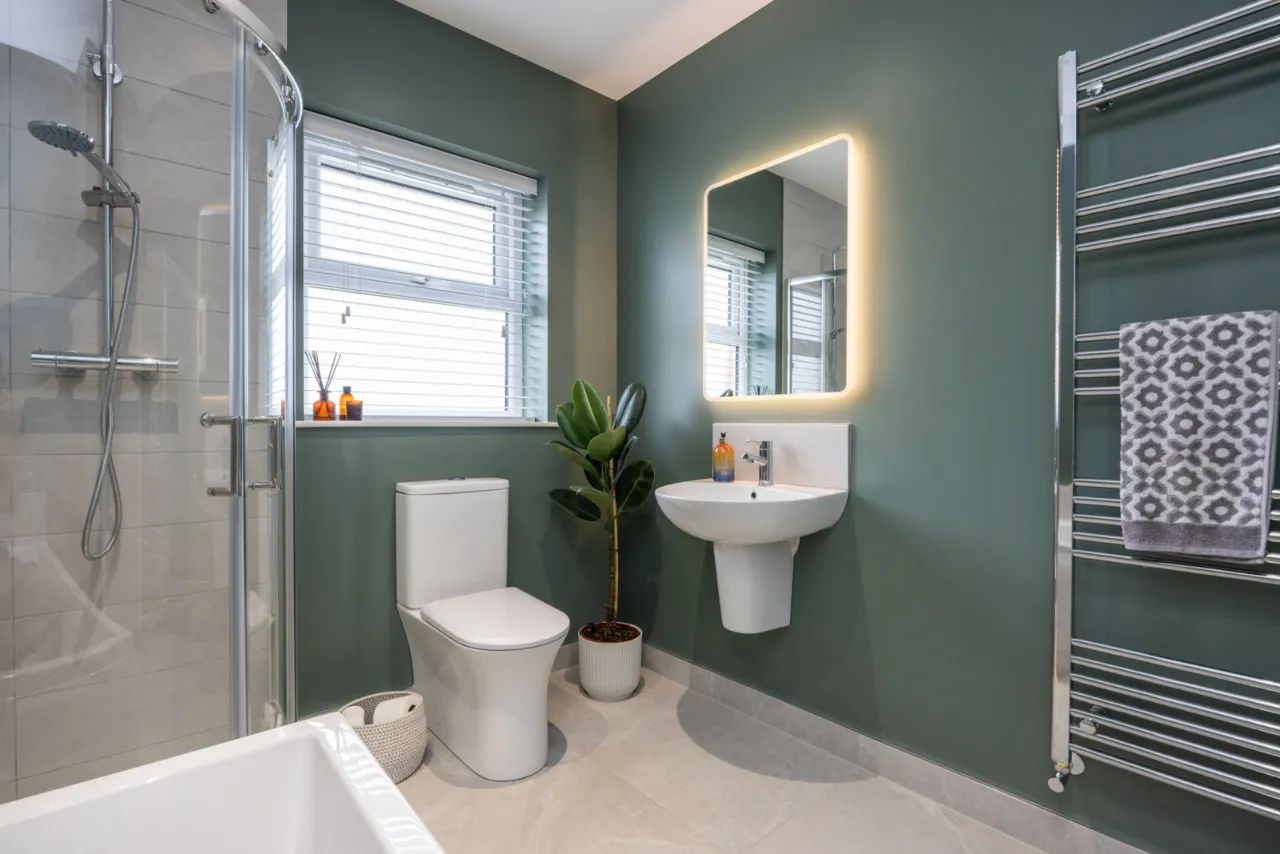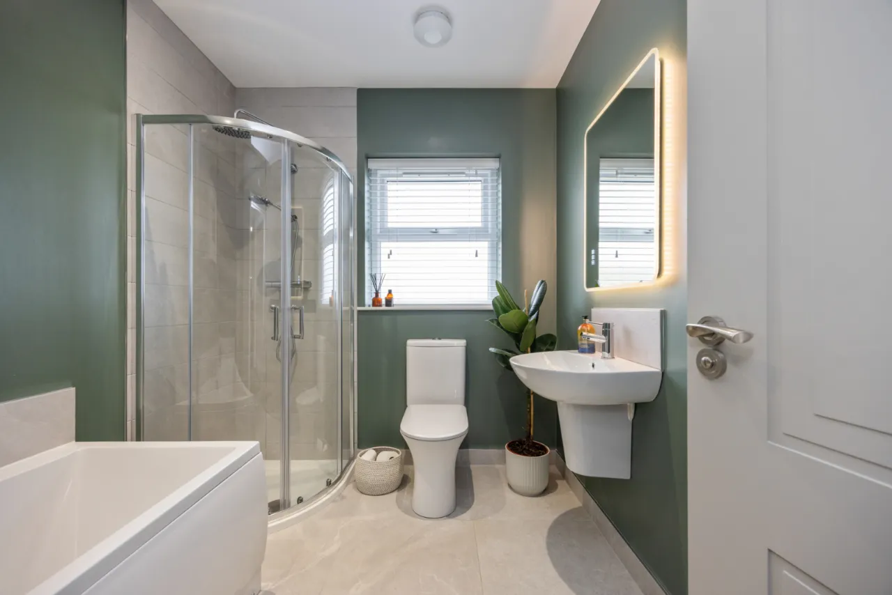 Comprising: Low flush WC, pedestal wash hand basin, fully tiled shower cubicle with chrome thermostatic shower unit, ceramic tiled floor, extractor fan, low voltage spotlights.