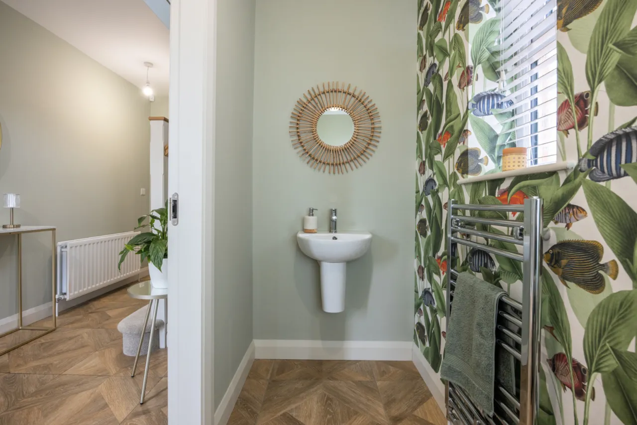 Wash hand basin with chrome mixer taps, concealed cistern WC, ceramic tiled floor, chrome heated towel radiator.