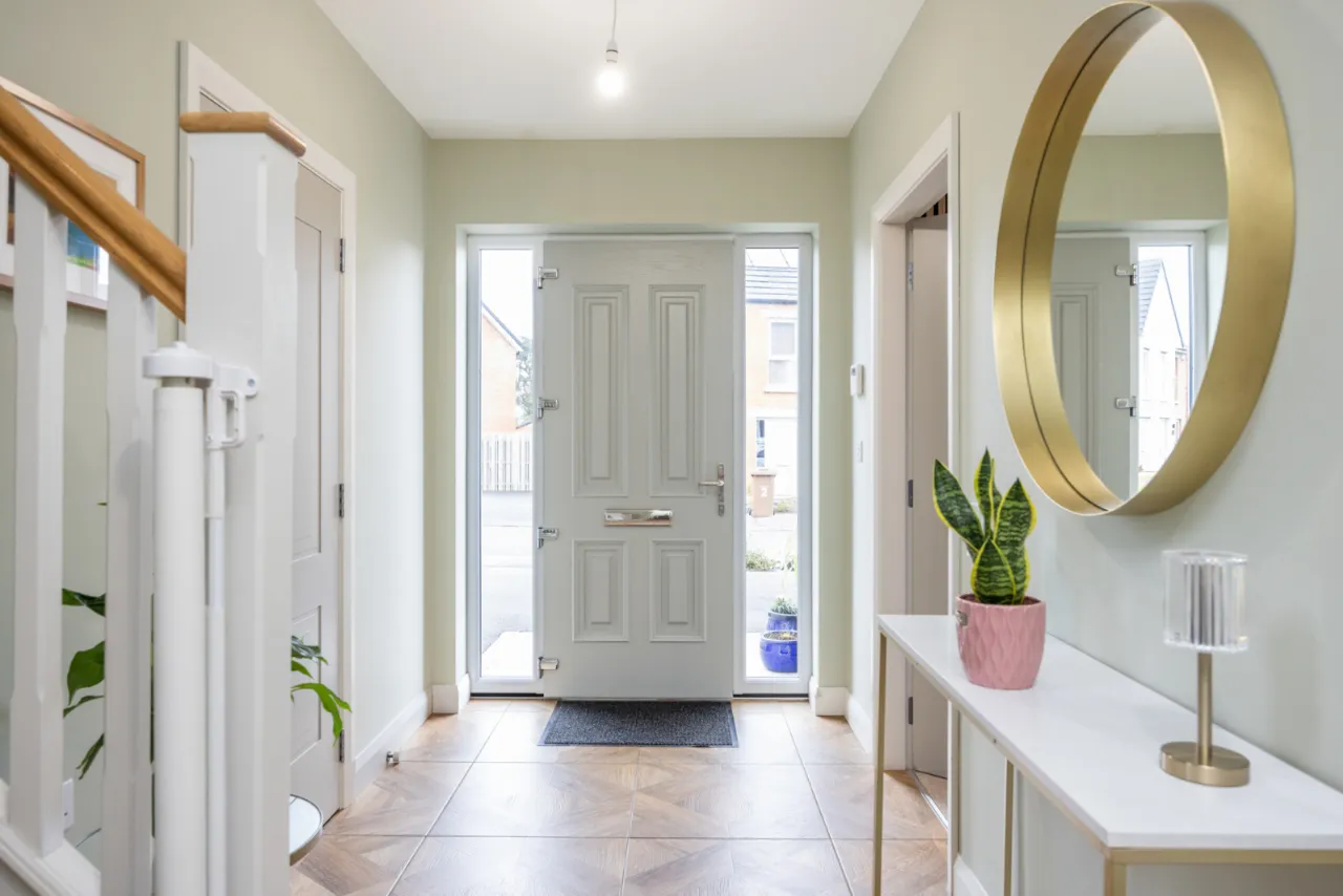 Composite front door with double glazed side panels, outside light.