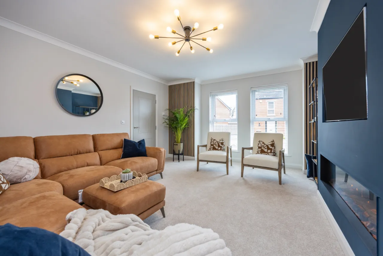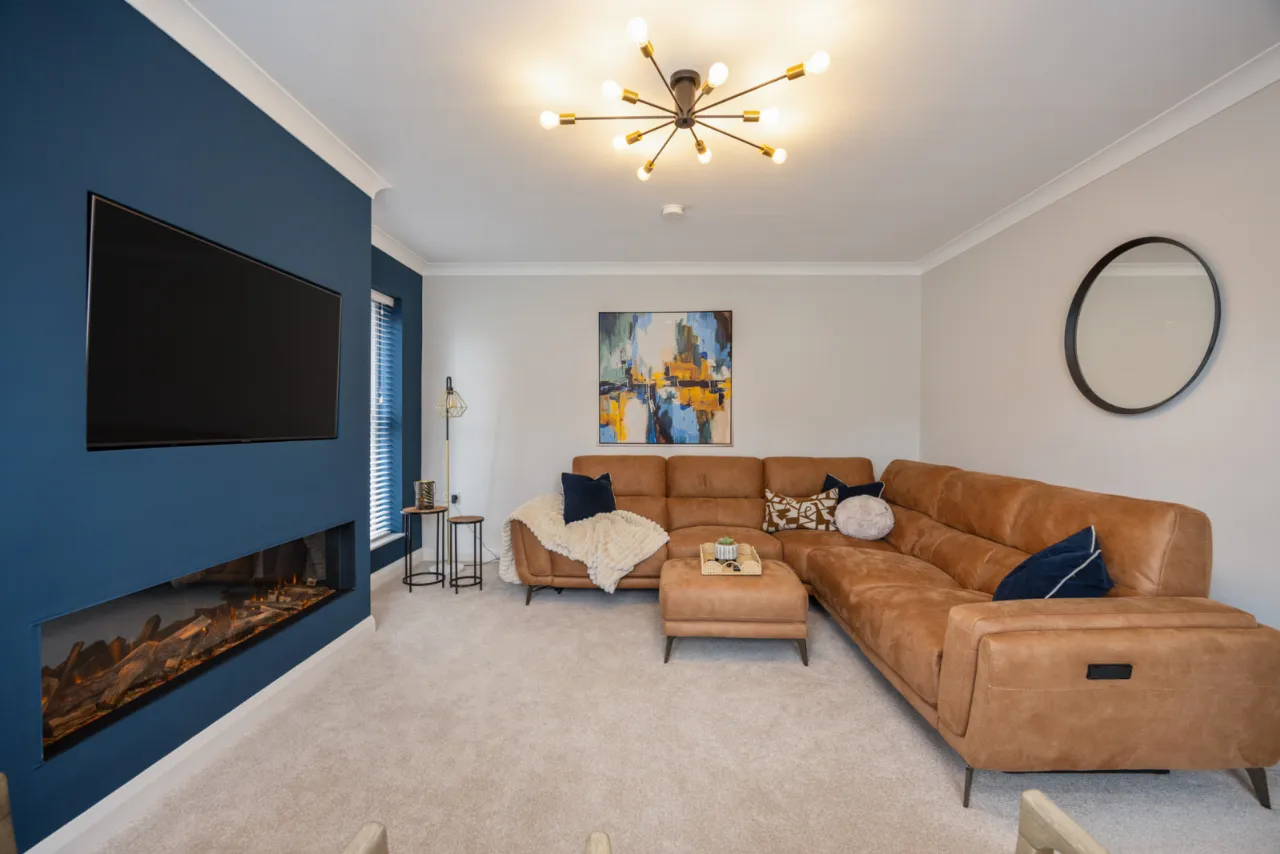 Newly fitted media wall with high end electric fire. Feature wood panelling.