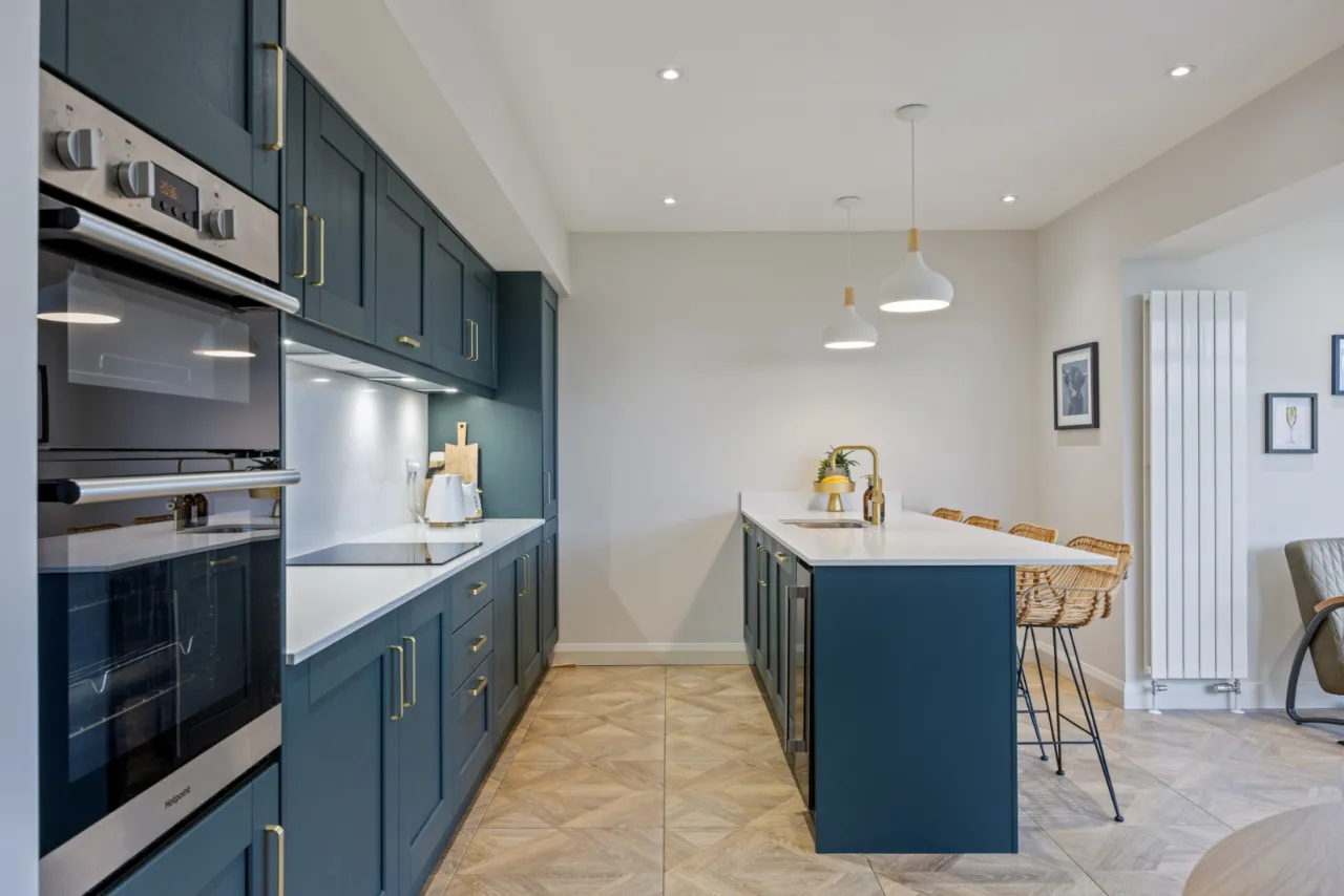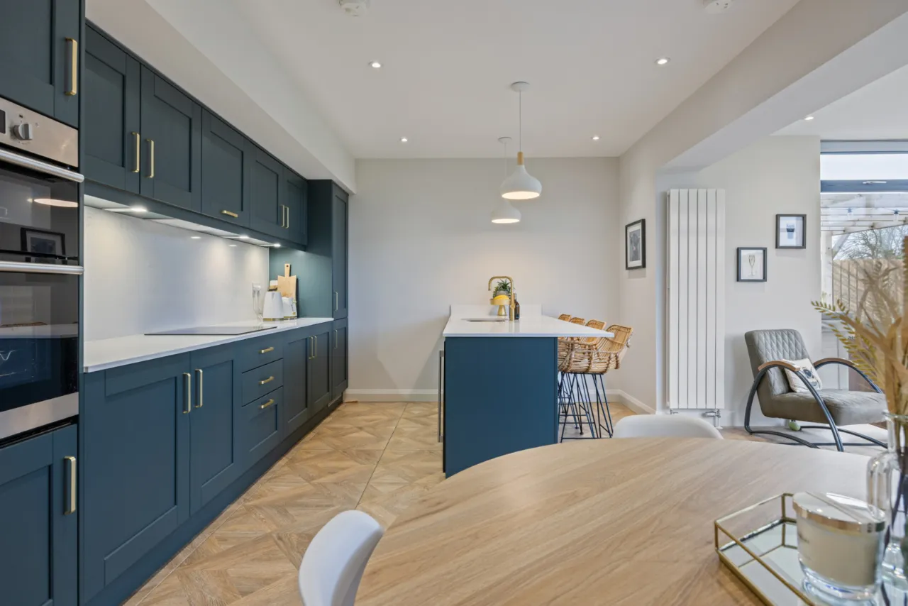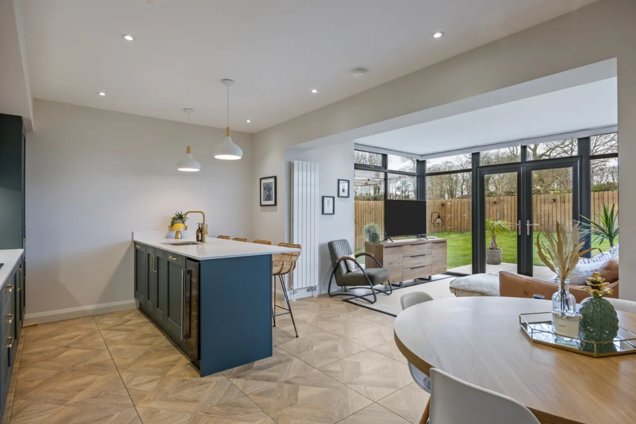 Excellent range of shaker style units with Quartz work surfaces, upstand and splashback, large island with built in breakfast bar, inset 1 1/4 bowl sink unit with feature mixer tap, integrated fridge and freezer, integrated dishwasher, integrated Induction hob with extractor above, high level double oven, integrated bins, ceramic tiled floor, uPVC double glazed French doors to patio and garden.
