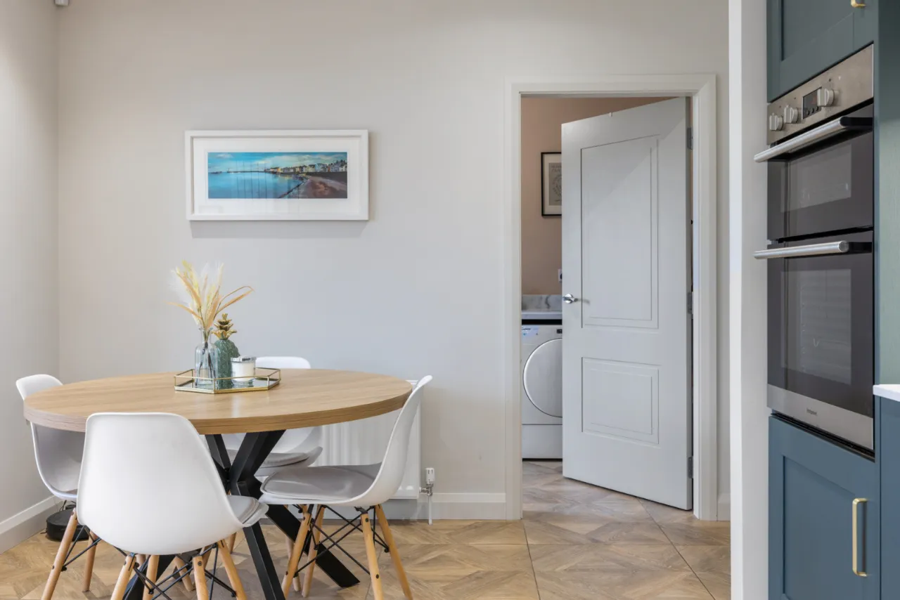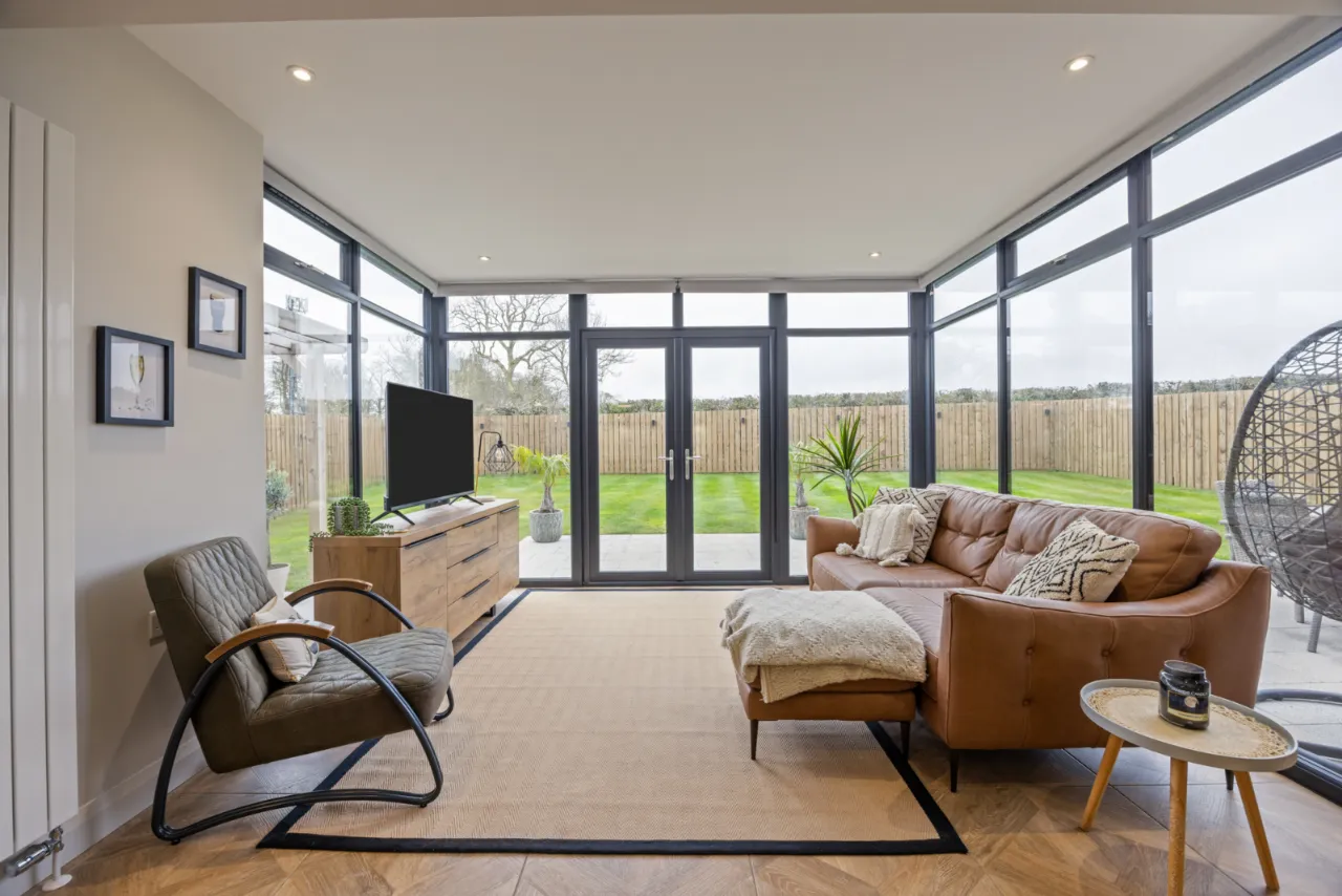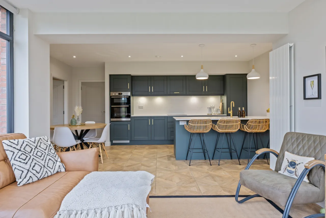 Excellent range of shaker style units with Quartz work surfaces, upstand and splashback, large island with built in breakfast bar, inset 1 1/4 bowl sink unit with feature mixer tap, integrated fridge and freezer, integrated dishwasher, integrated Induction hob with extractor above, high level double oven, integrated bins, ceramic tiled floor, uPVC double glazed French doors to patio and garden.