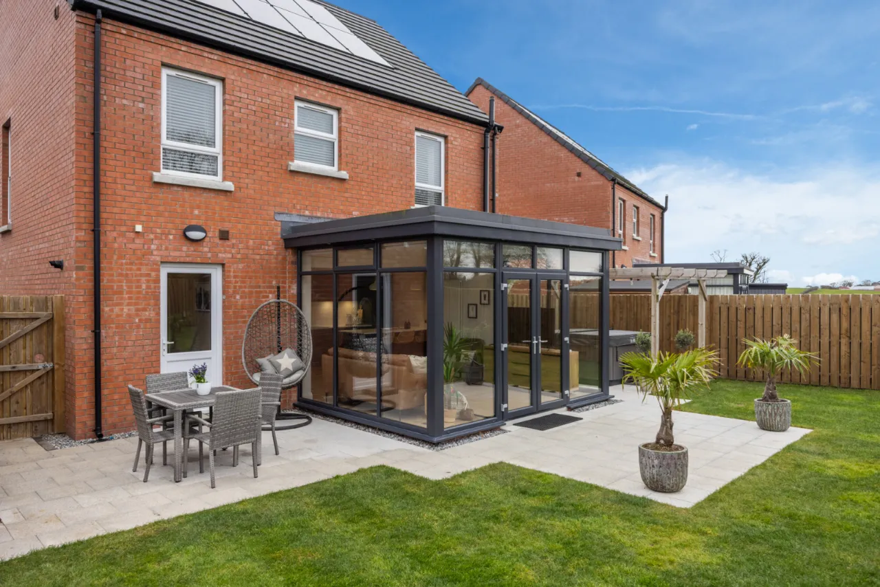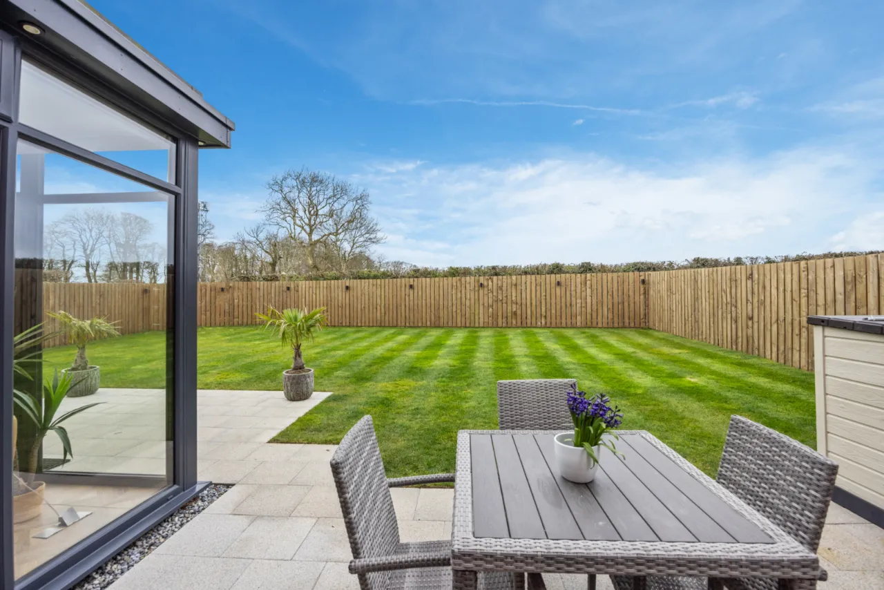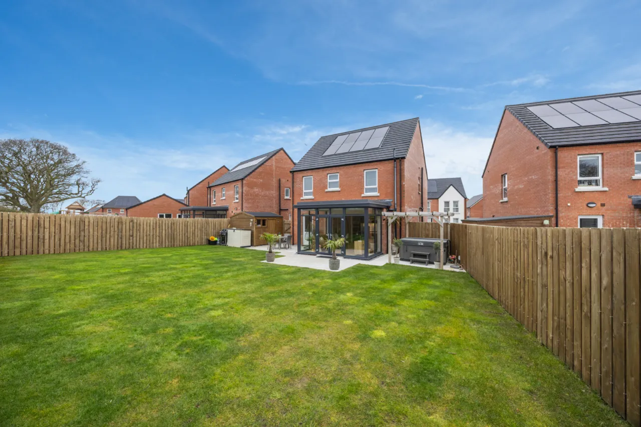 Large, private south-facing rear garden laid in lawns with extensive paved patio area, outside tap, outside lighting, outside power, hot and cold water tap, EV charging point. 8 solar panels.