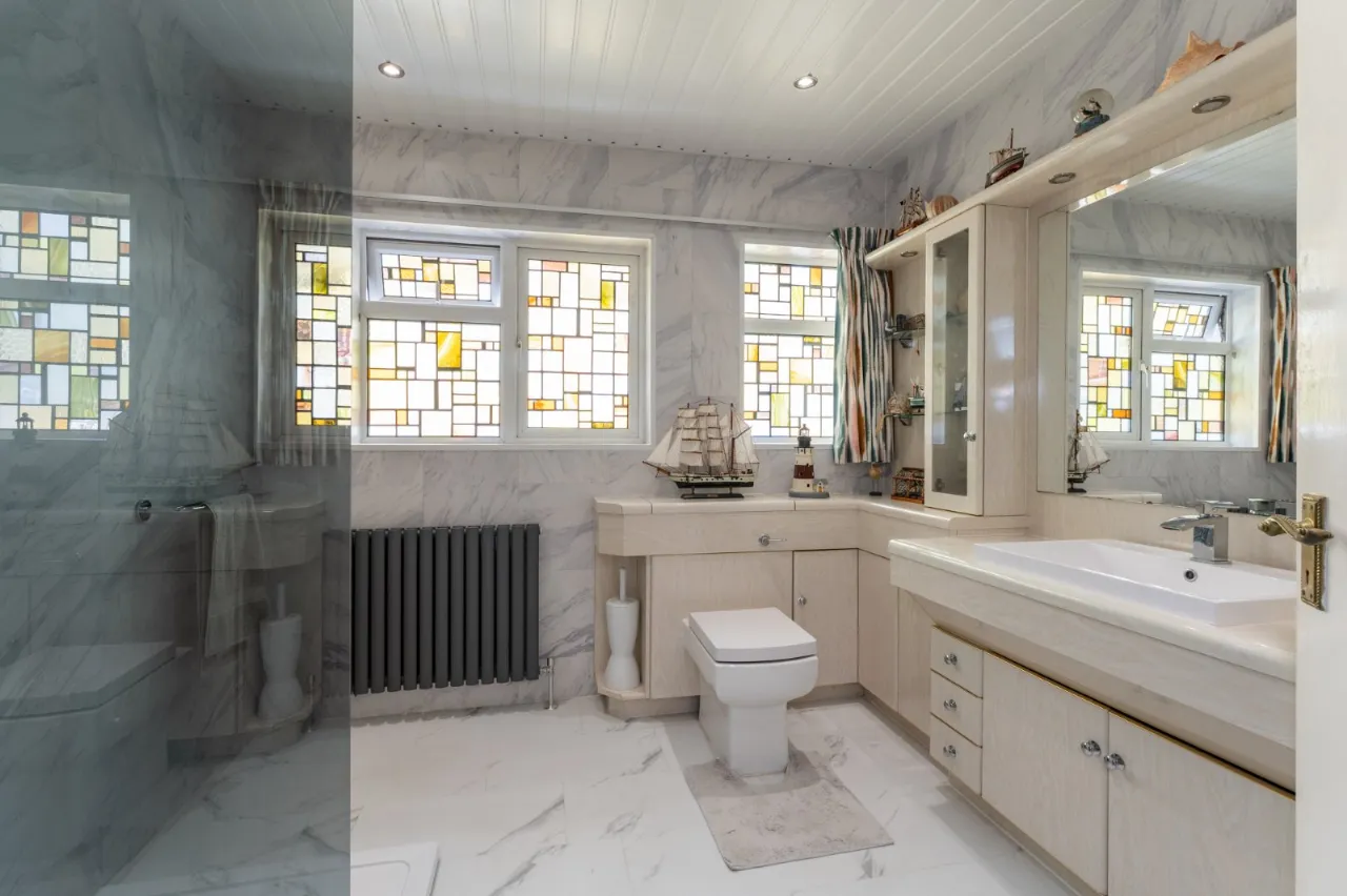 White suite comprising of close couple WC, wash hand basin with vanity unit, walk in shower cubicle, electric shower, feature stained glass window, heated towel rail, built in shelving