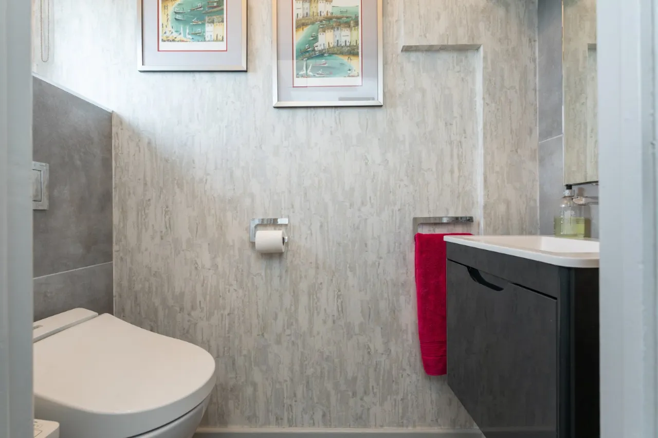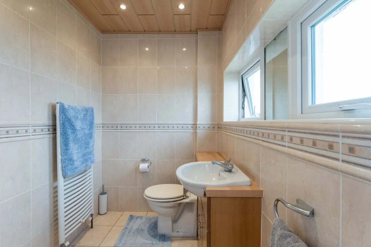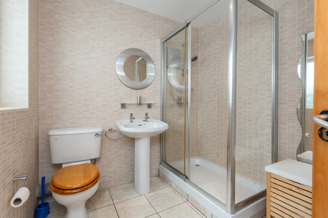 Low flush WC, pedestal wash hand basin, fully tiled shower cubicle with electric shower, fully tiled walls