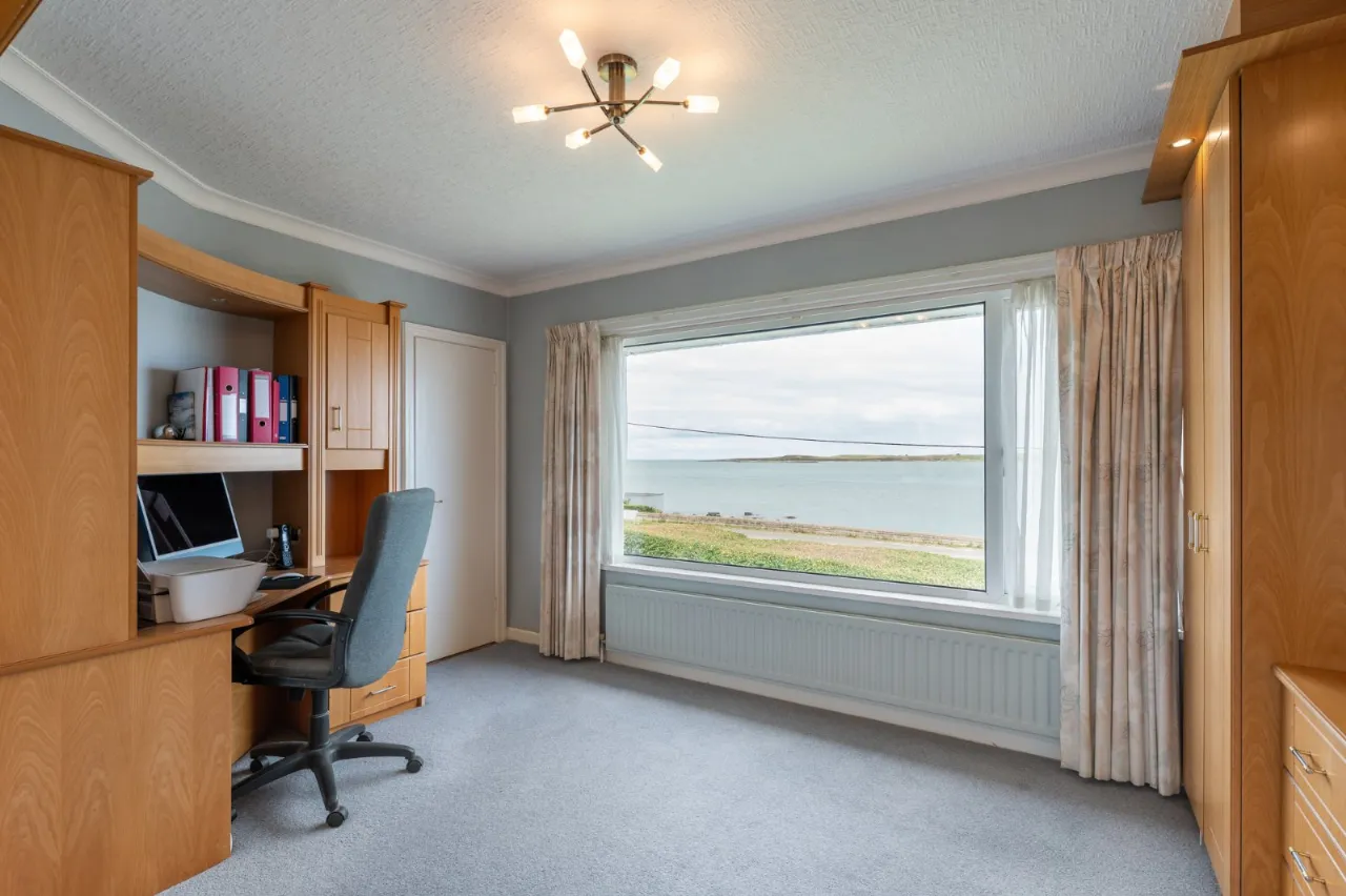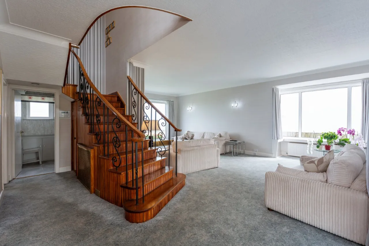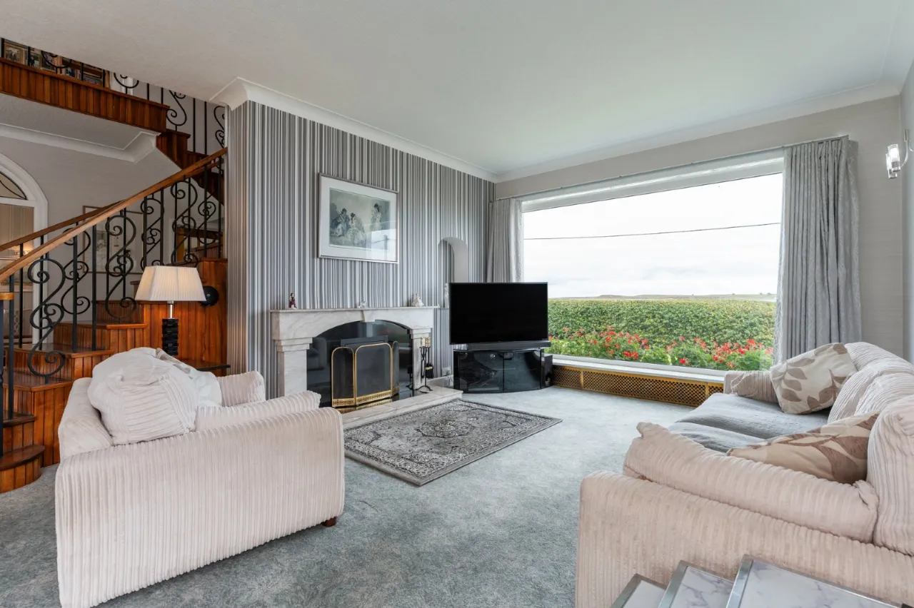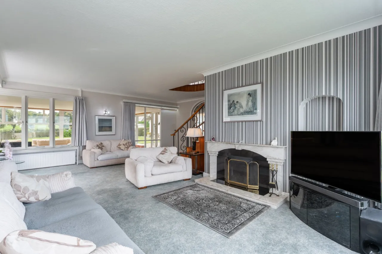Sea views, marble fireplace and hearth, open fire with boiler, cornice ceiling, wall lighting
