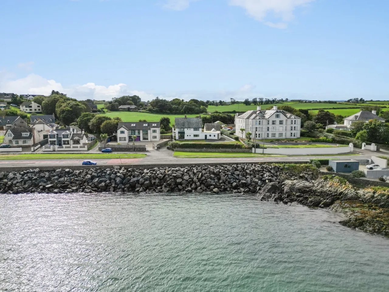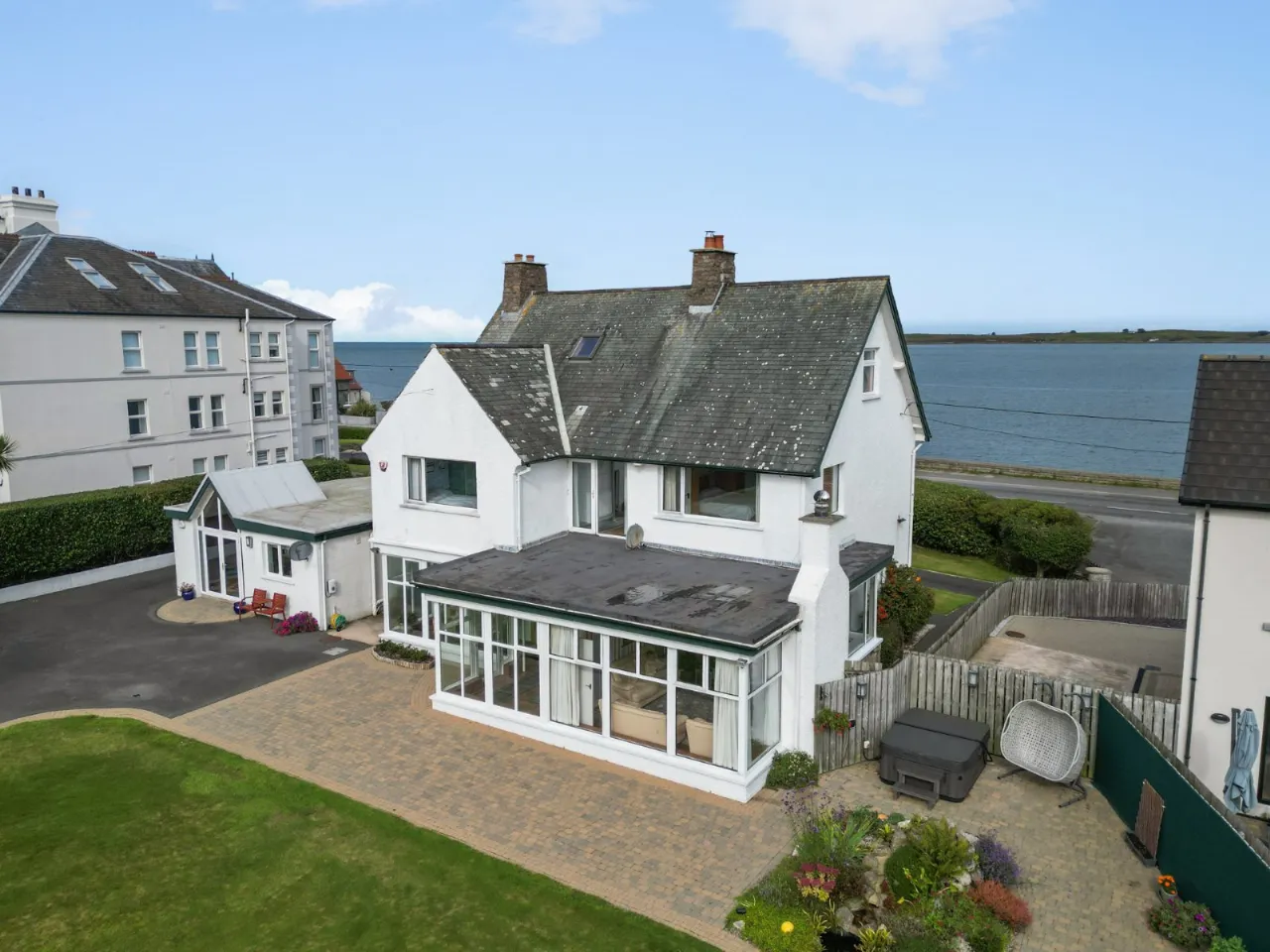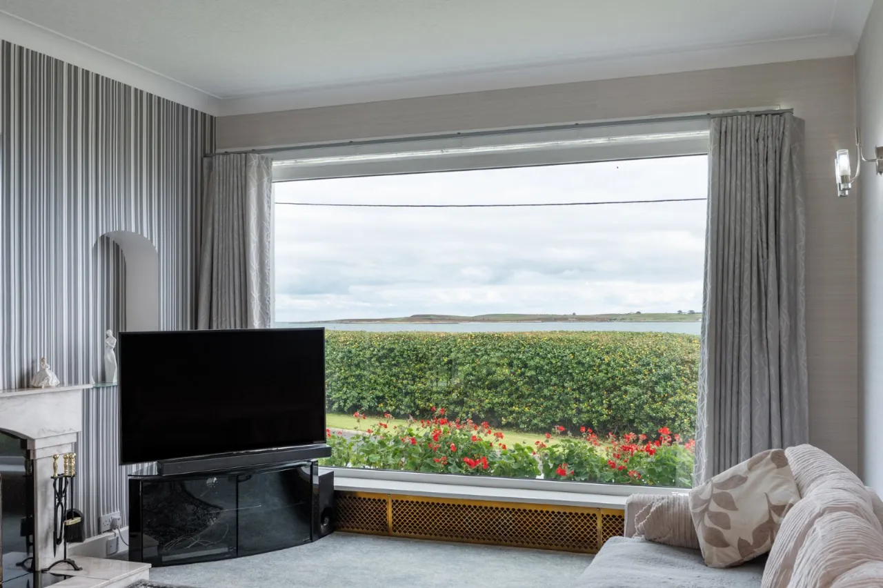 Sea views, marble fireplace and hearth, open fire with boiler, cornice ceiling, wall lighting