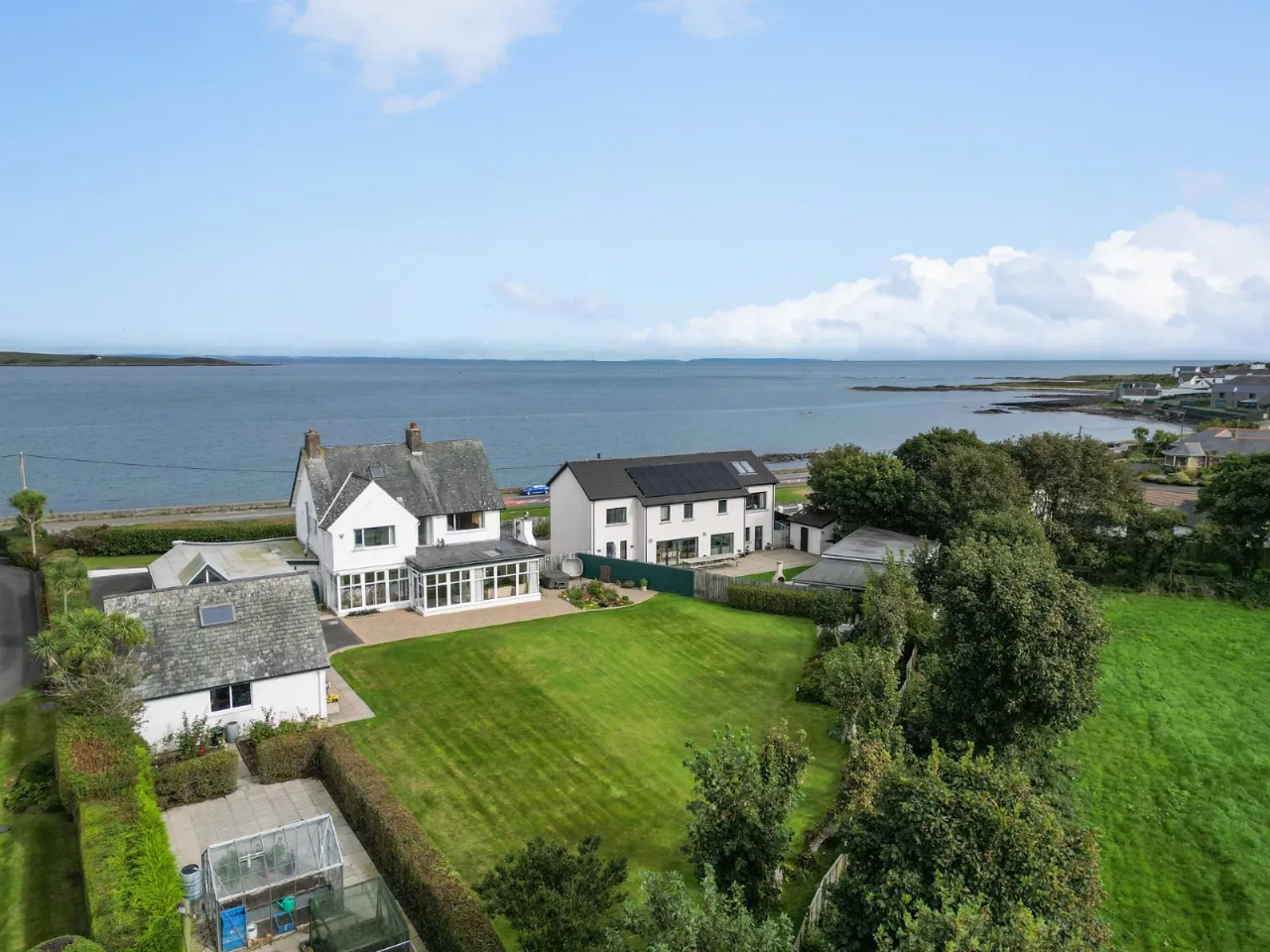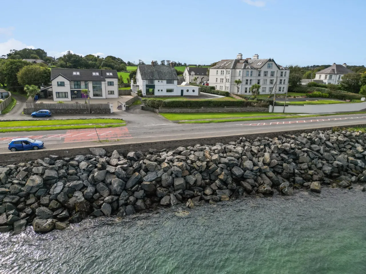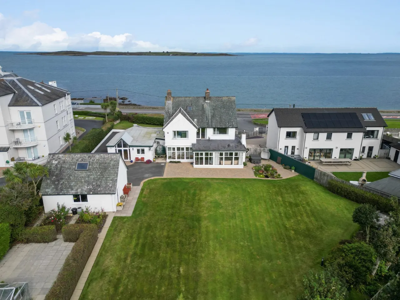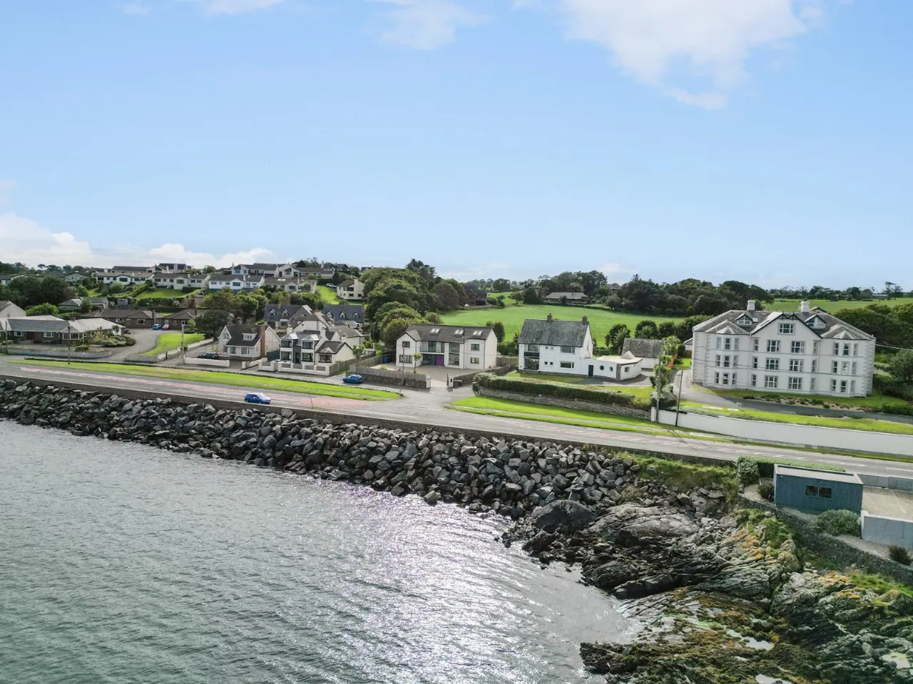 Sea views, marble fireplace and hearth, open fire with boiler, cornice ceiling, wall lighting