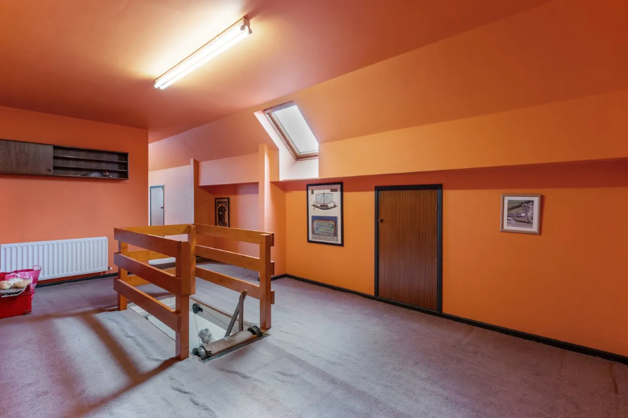 Oil fired boiler, up and over electric door, fully floored roofspace accessed via slingsby ladder
