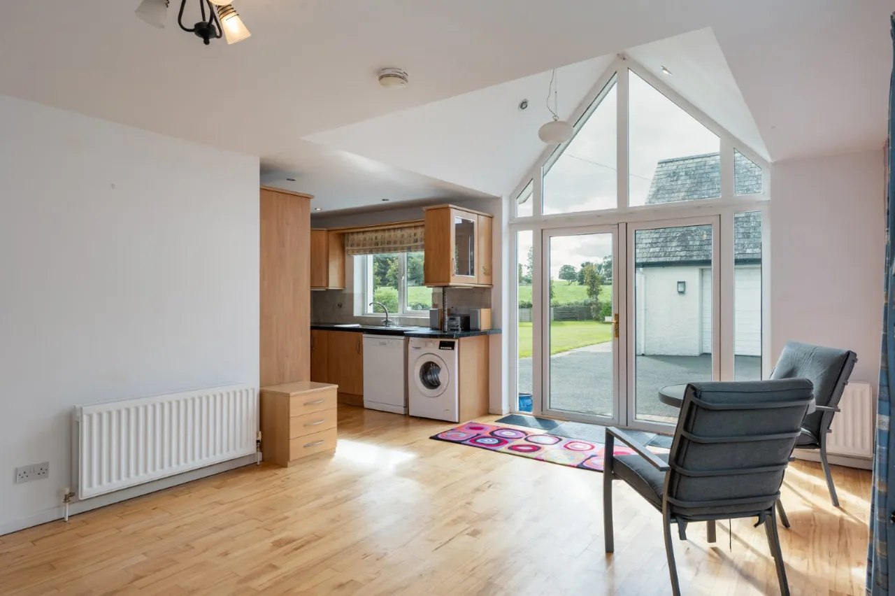 Solid wood floor, vaulted ceiling, kitchen with range of high and low level units, space for fridge freezer, space for cooker, space for dishwasher, plumbed for washing machine, single drainer stainless steel sink unit, uPVC double glazed door to garden, built in cupboards