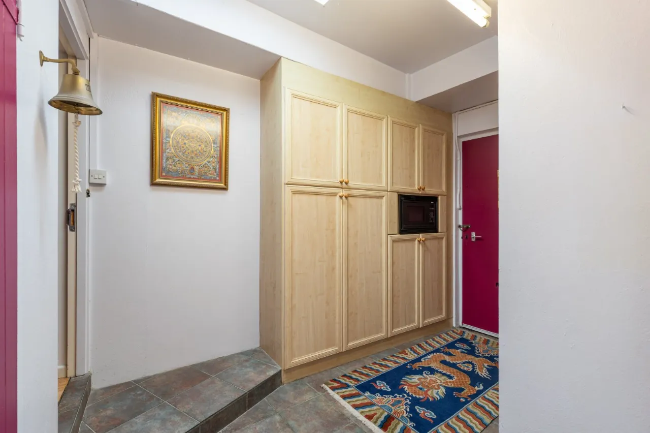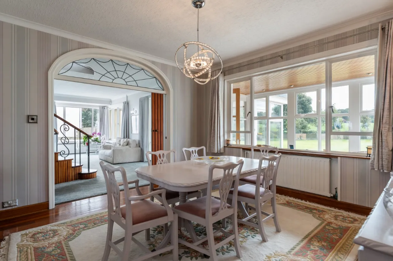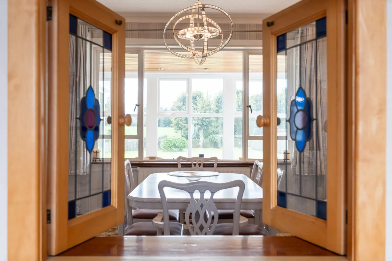 Solid wood floor. Stained glass hatch to kitchen.