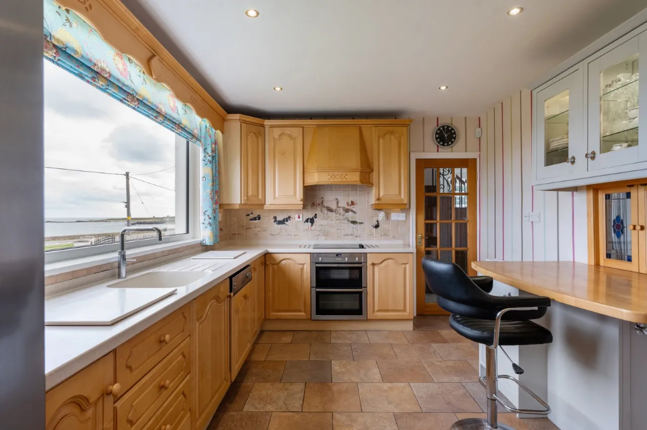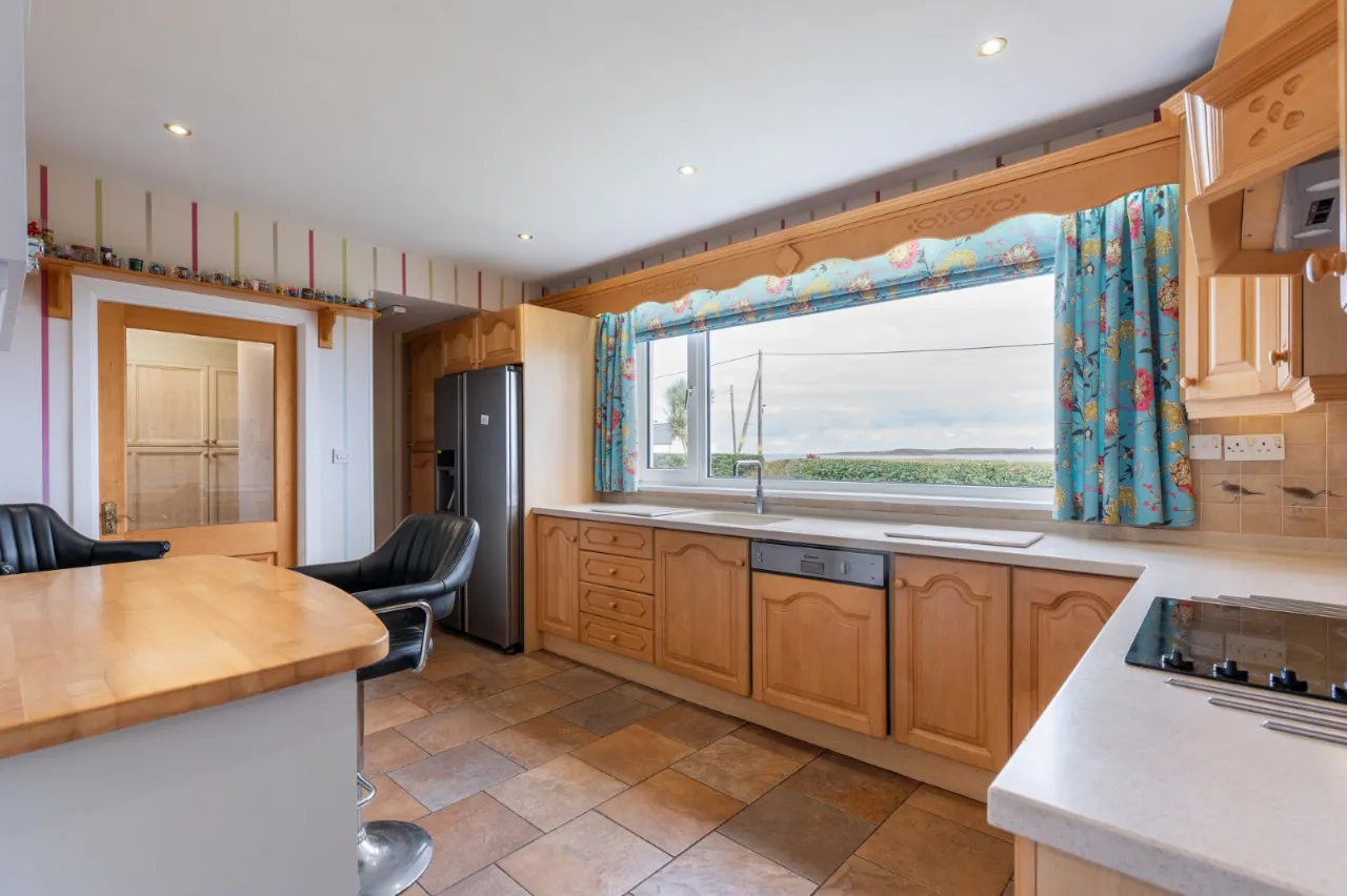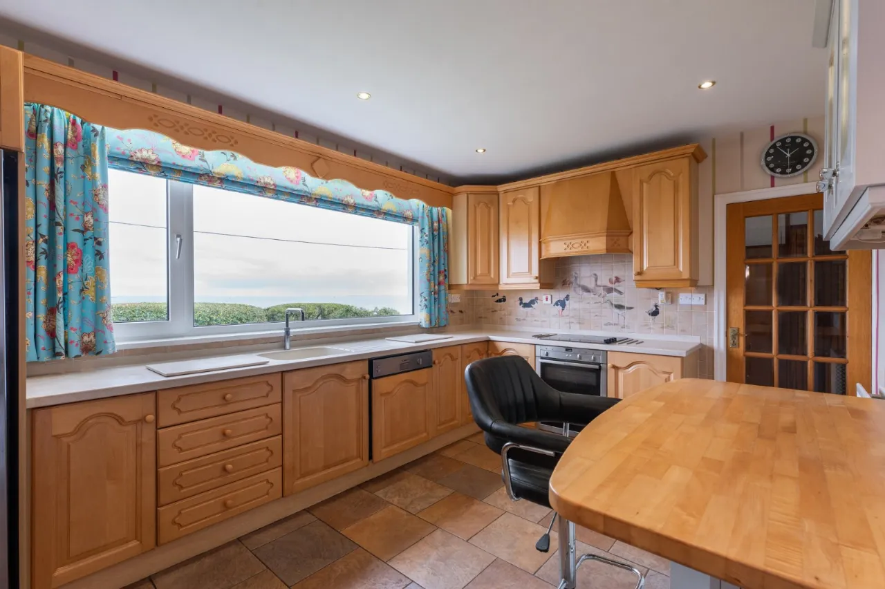 Excellent range of high and low level solid maple units, Corian work surface, inset drainer 'Quooker' hot water tap. Integrated dishwasher, integrated electric under bench oven, 4 ring ceramic hob, built in breakfast bar, glass display cabinets, ceramic tiled floor, low voltage spotlighting, space for American fridge freezer, sea views, access to annex. Stained glass hatch to kitchen.